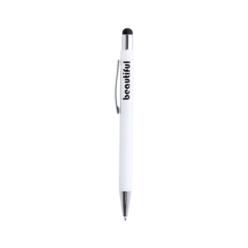 Pointer ball pen with push-up mechanism and body in an elegant, aluminum, matt white color design. Pointer in a wide range of vivid colors, in matching color with the inner tone and with chromed details. Outer surface especially designed for laser printing: when engraving the logo, the inside color of the item is shown. Jumbo cartridge and blue ink.