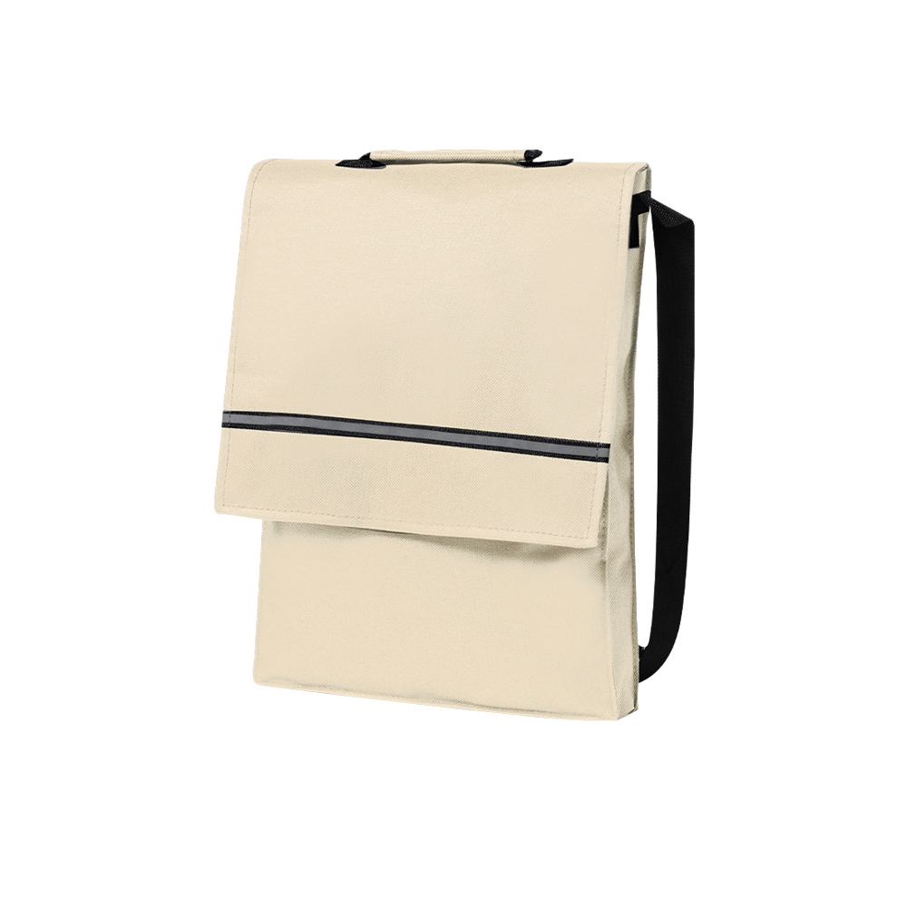Document bag with velcro closure flap in brightly colored 600D polyester with reflective front stripe. With matching color reinforced handles, adjustable shoulder strap and inside compartments with pen and smartphone pockets.