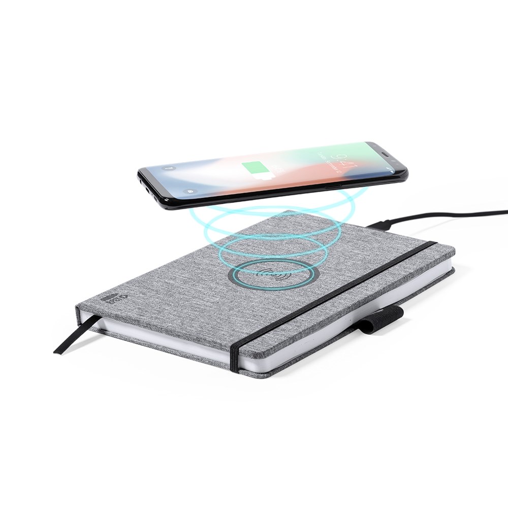 Nature line A5 size notepad in durable 300D RPET polyester, made from recycled plastic to encourage the reuse of plastic waste and help the sustainability of the planet. With 10W wireless charger integrated in the cover. Including 80 sheets with single-stripe layout. Compatible with smartphones with wireless charging technology. Type C charging cable and instruction manual in English and Spanish.
