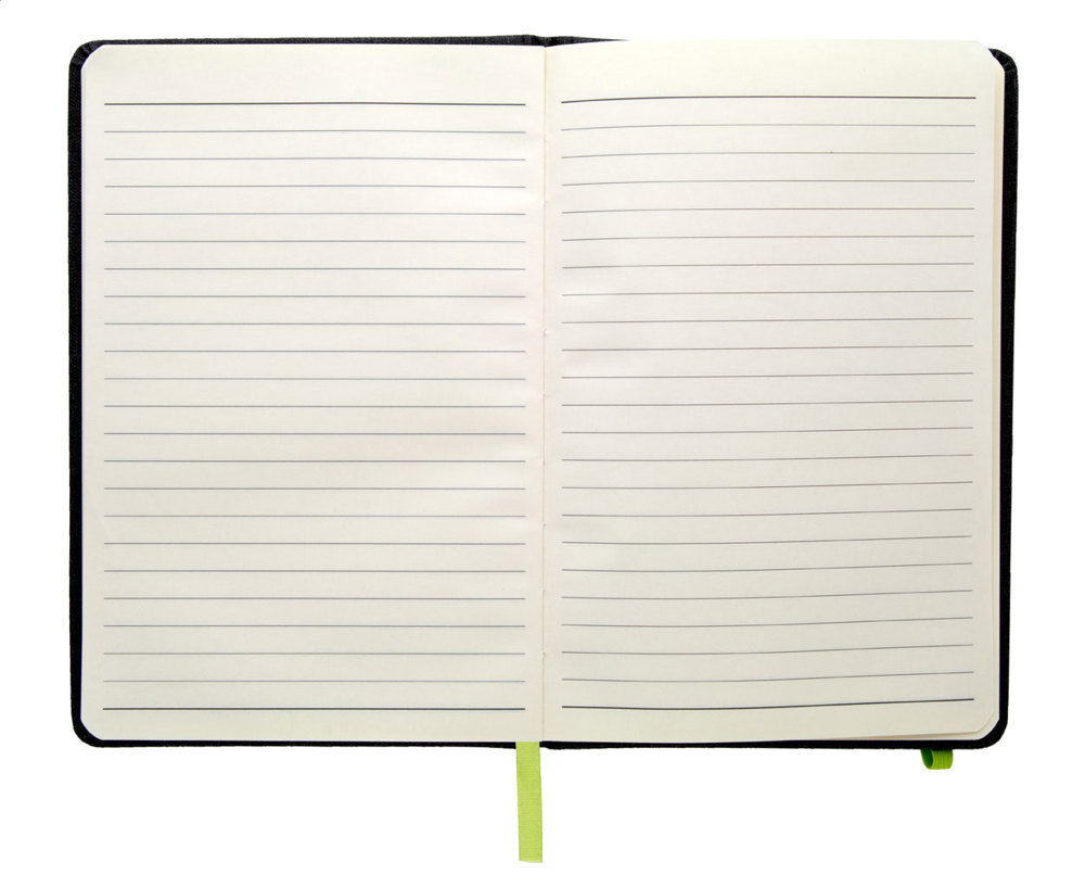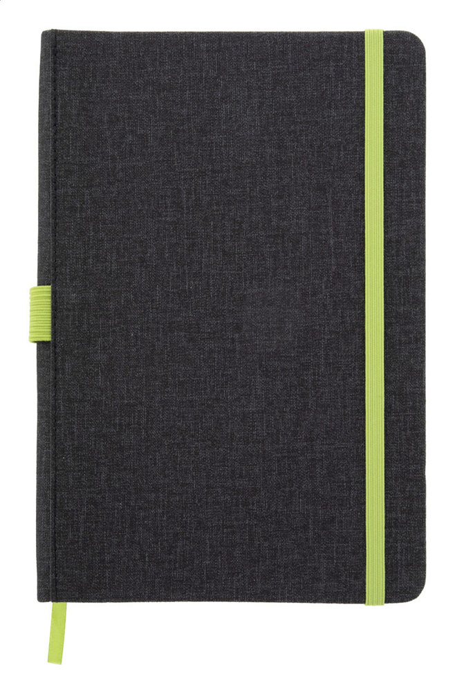 Textured PU leather covered notebook with matching bookmark, rubber band and pen holder. 96 lined sheets, A5 size.