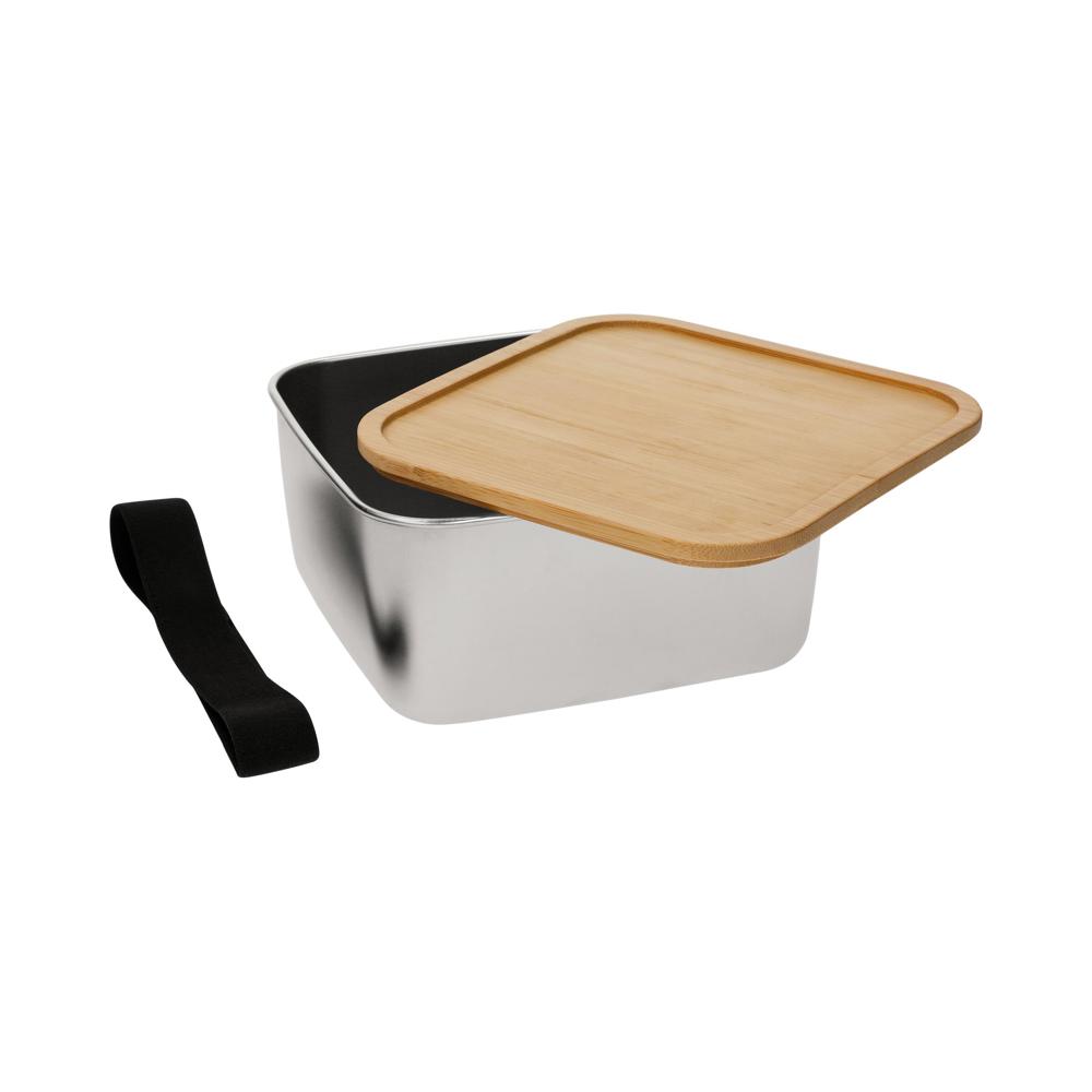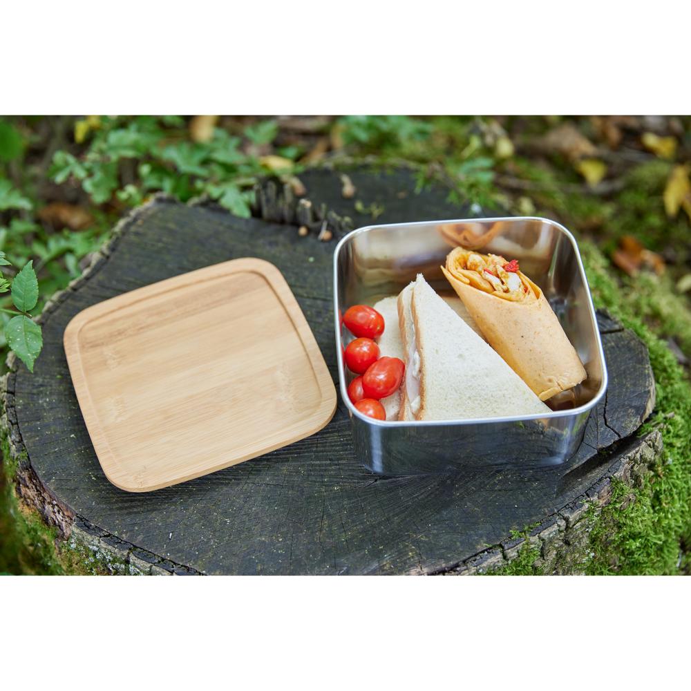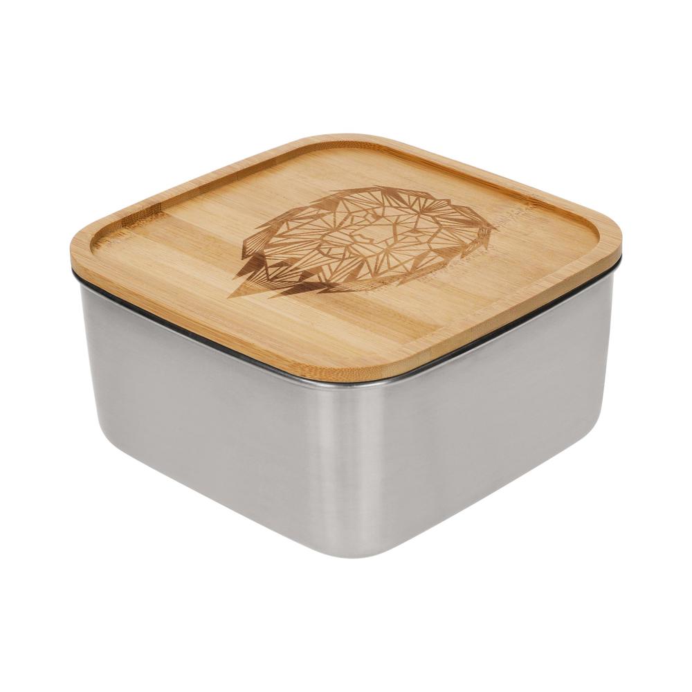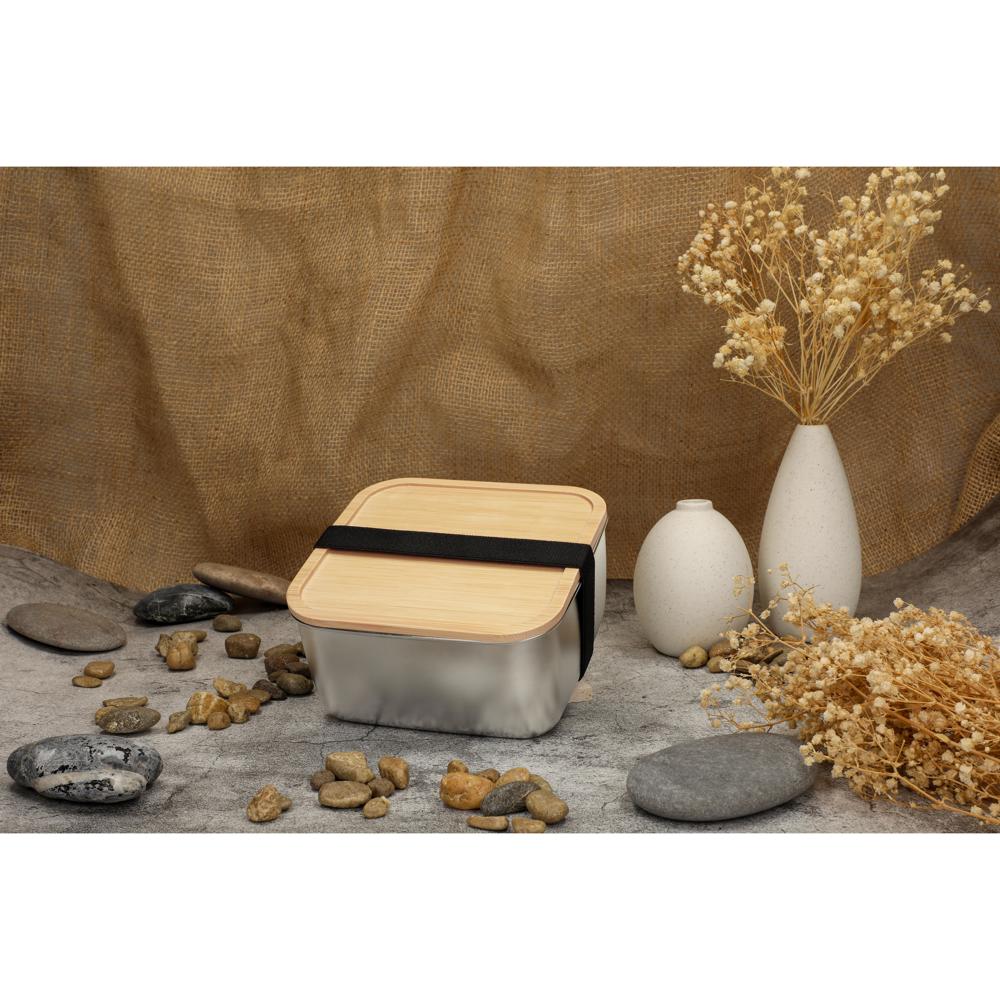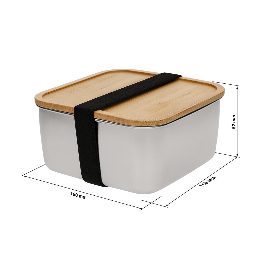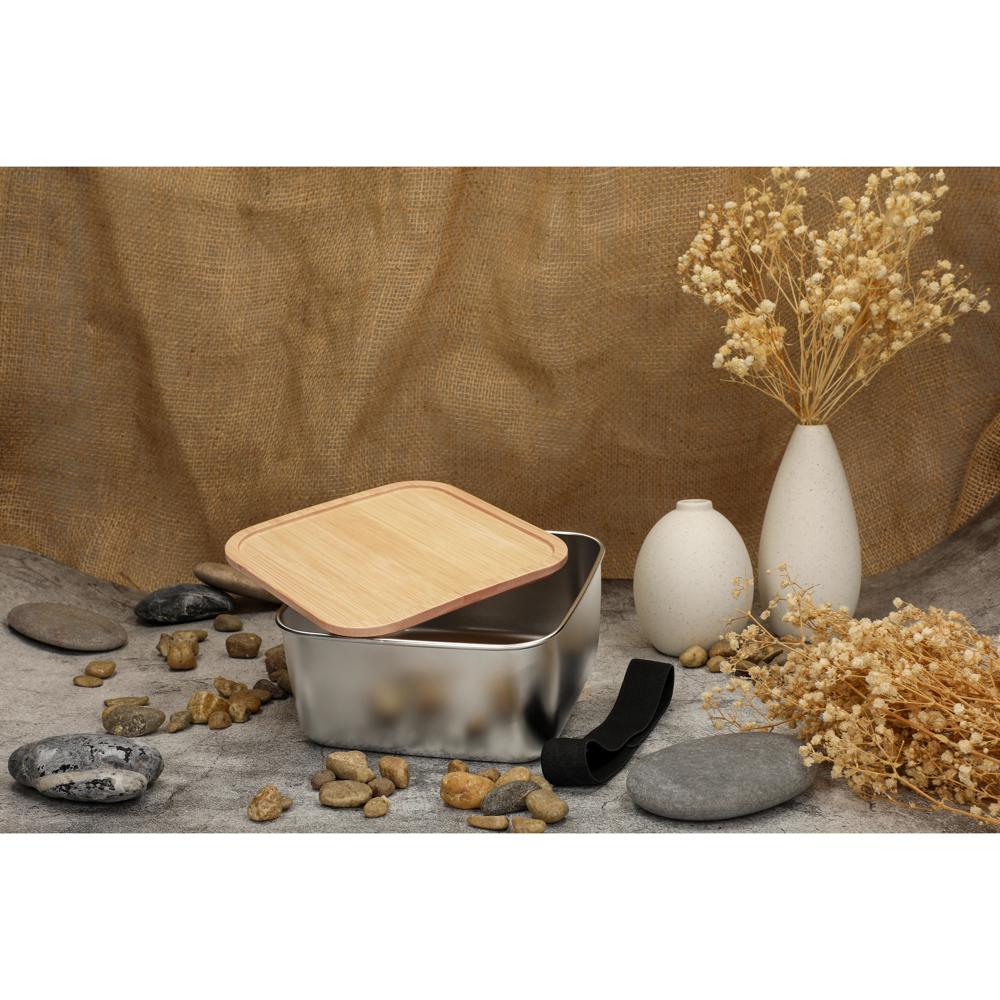 Stylish lunch box with a stainless steel bowl and a lid made of bamboo wood. The box is held together with a rubber band. The lunch box is perfect for storing food or for taking it with you to the office, to school or to nursery school. Made from high-quality materials, robust, sustainable and easy to clean.