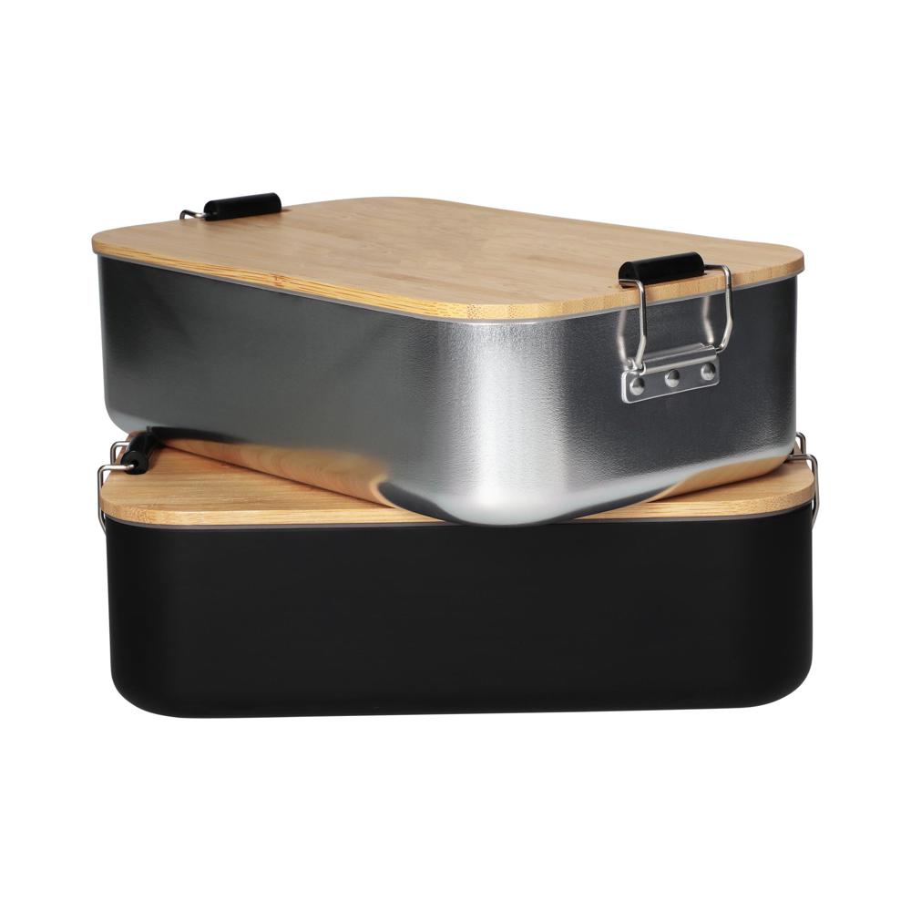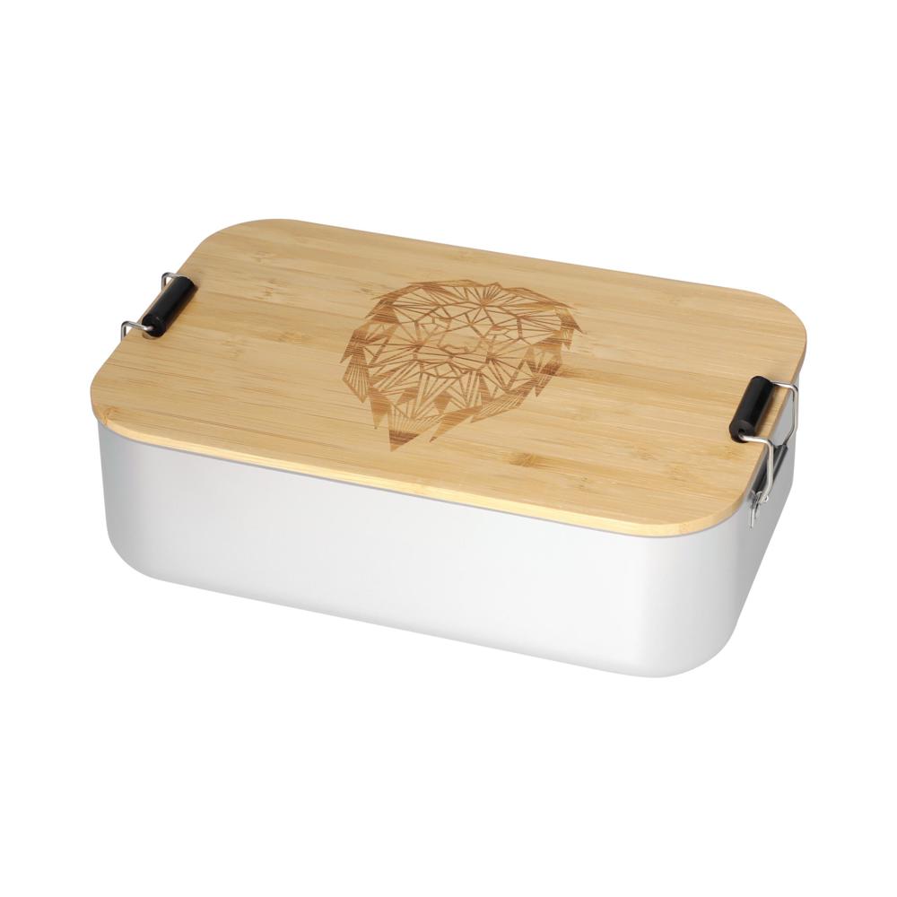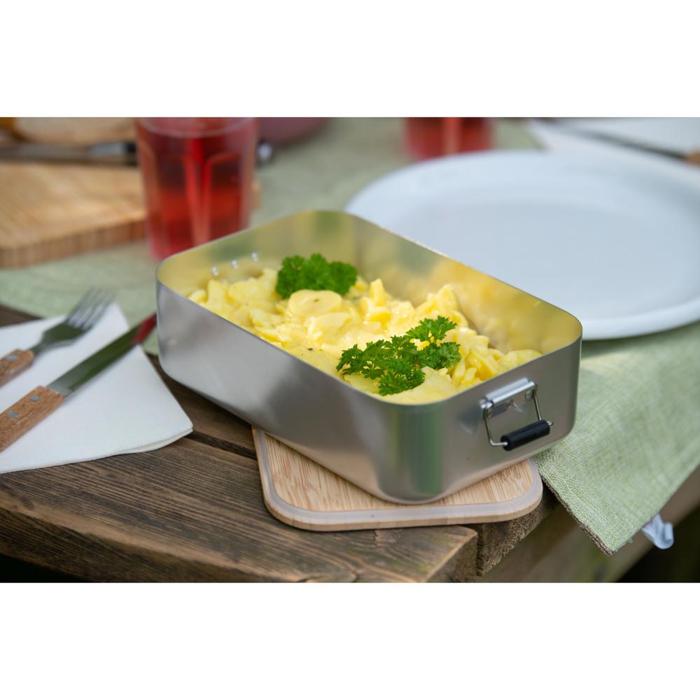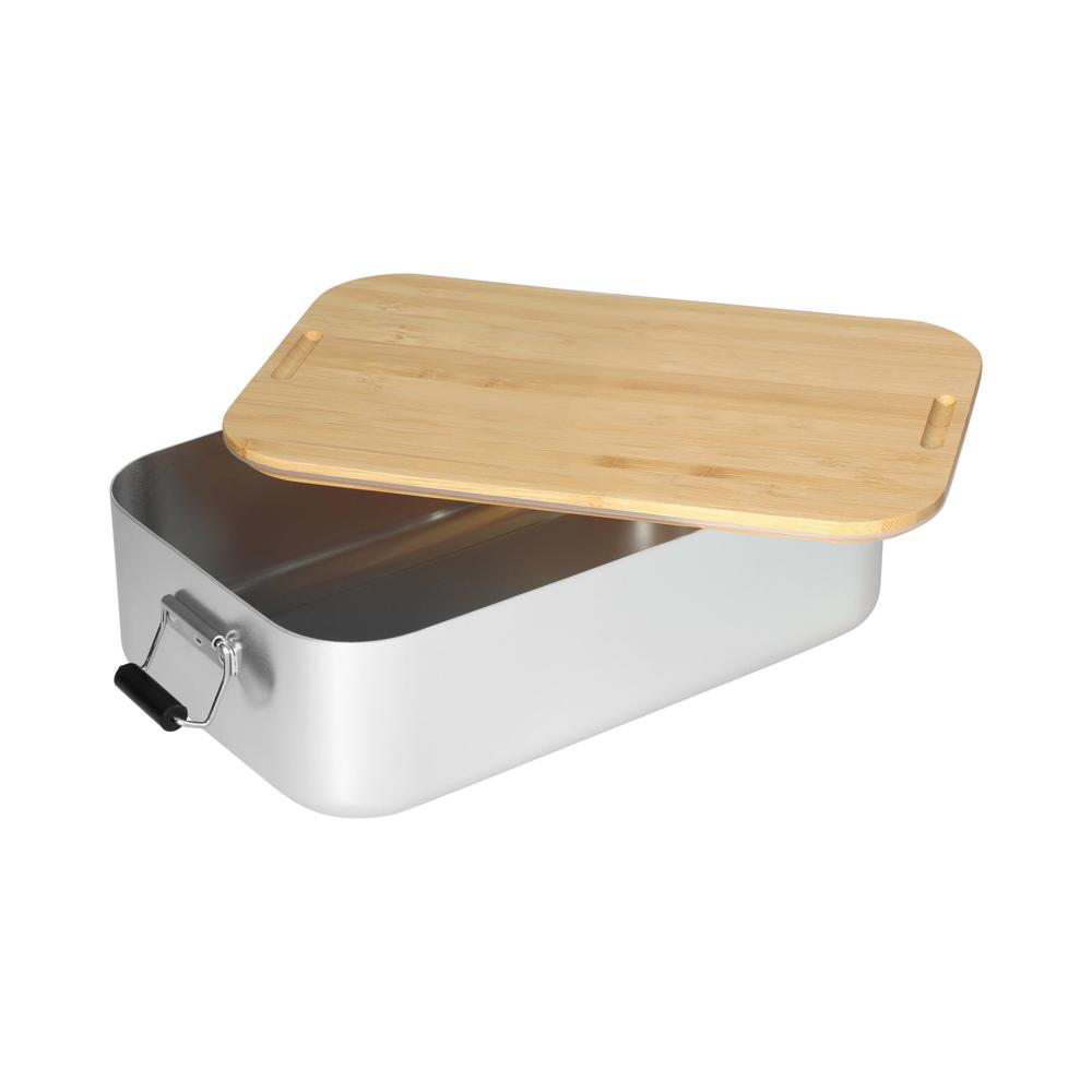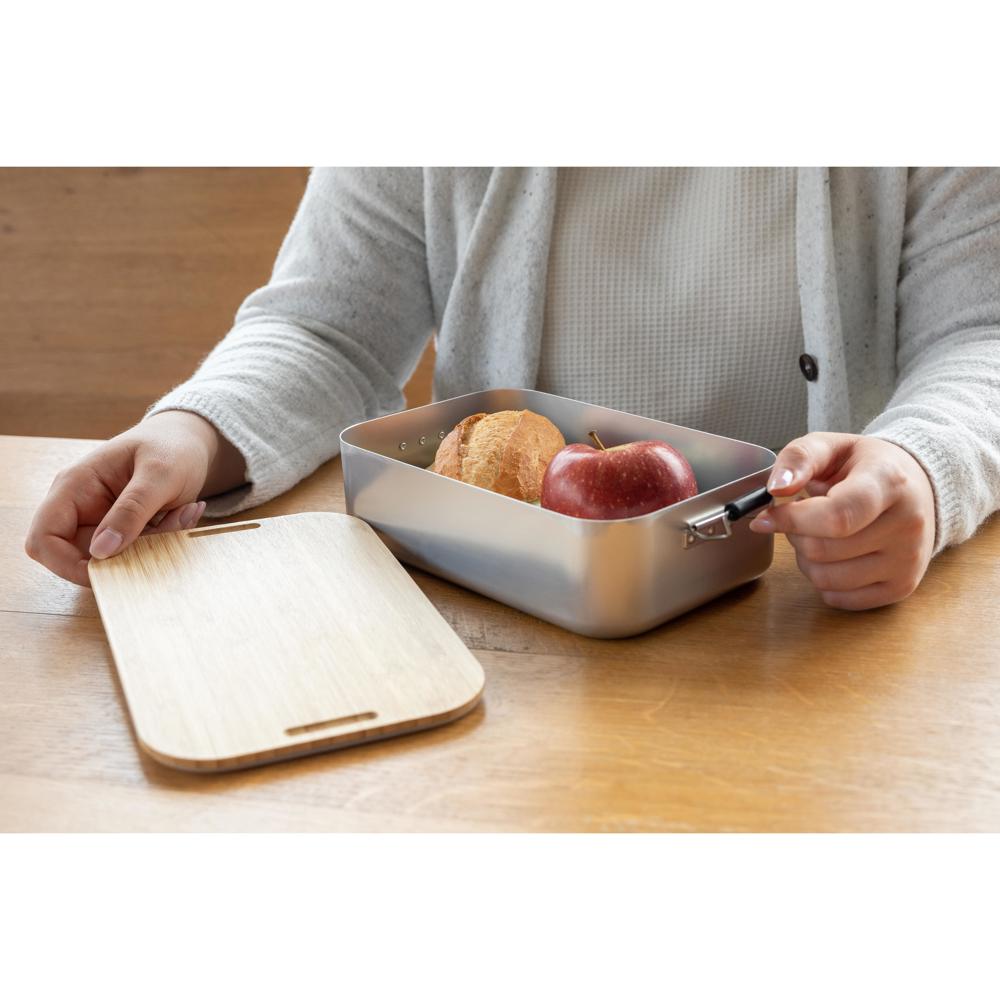 Large, plastic-free lunch box for your promotion. The container is in aluminium, the lid is made from bamboo and has a silicon ring and clamp to ensure reliable closure. The lid is completely removable and can be used as a chopping board if needed.