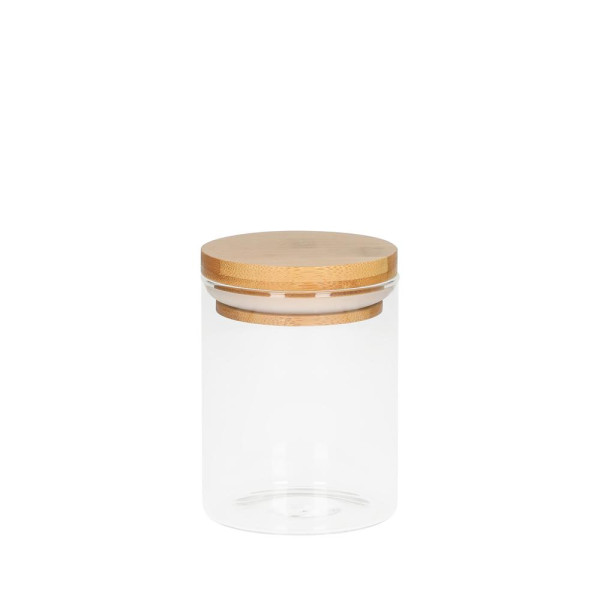 Environmentally-friendly storage container for keeping your kitchen and home tidy. The glass cylinder is made from high-quality borosilicate glass. The lid is in bamboo and has a silicon ring to ensure reliable closure. The large opening allows quick, easy access to stored foods, easy to clean and rinse. Exceptionally suitable for the storage of things like rice, noodles, nuts, flour, tea and spices. Capacity: 350 ml.