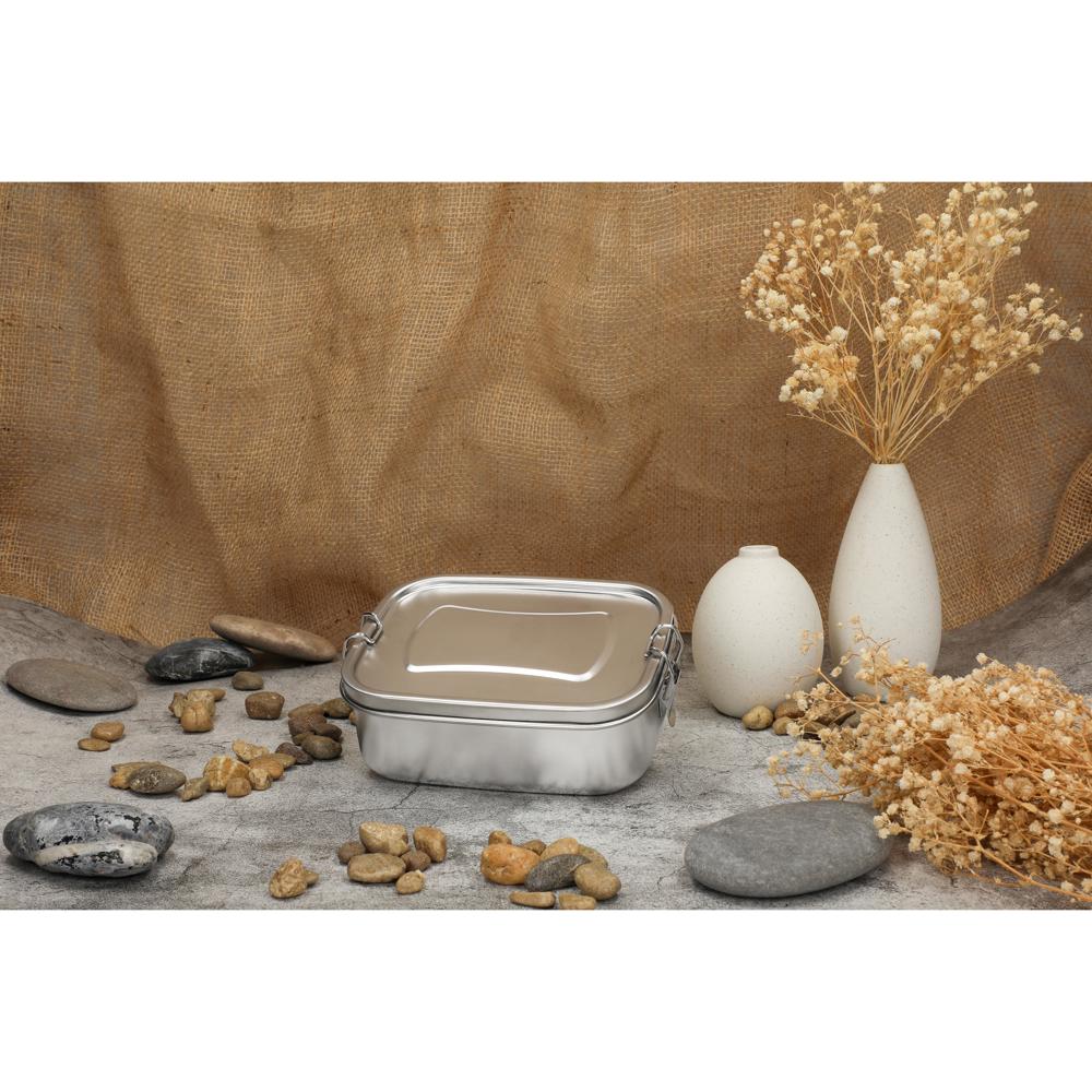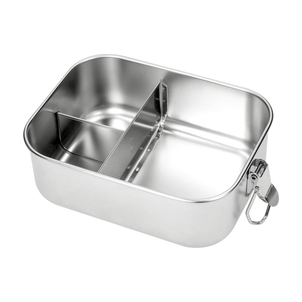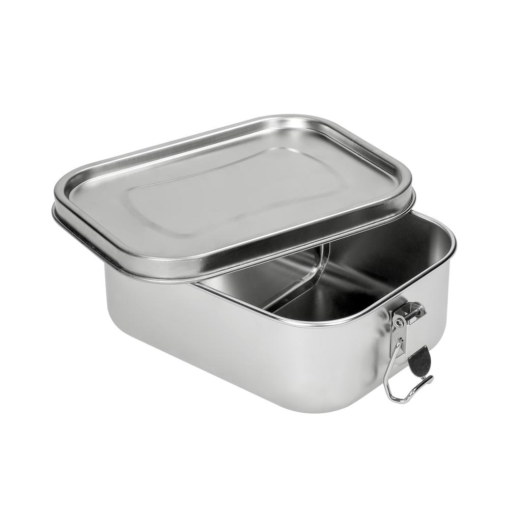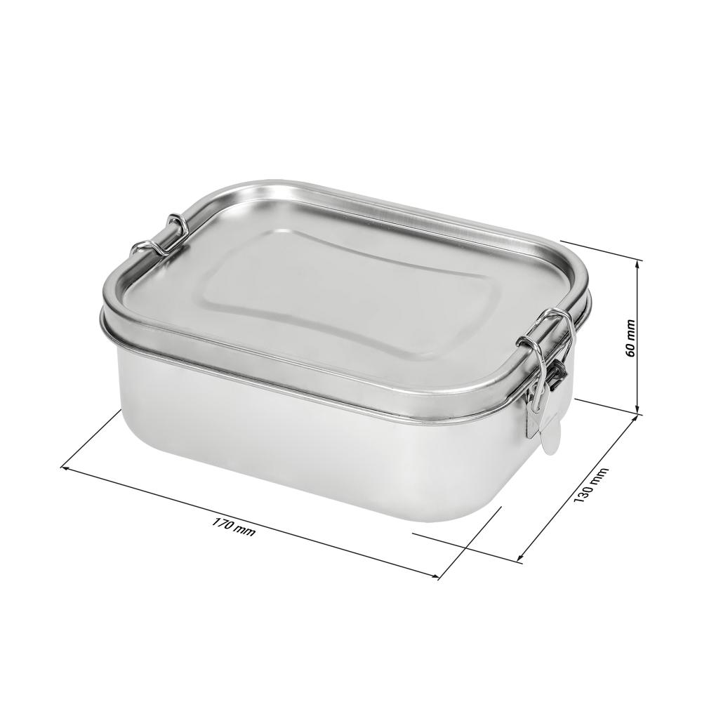 Ideal for lunch or for a snack between meals. The stainless steel storage container can be used time and again, which makes it a perfect environmentally friendly alternative to aluminium foil and cling film. The securely welded compartments inside the box - visible at the weld points on the underside of the box - keep various foods safely separated. It features a sealing ring and sturdy clamps at the sides. Not suitable for liquid foods.