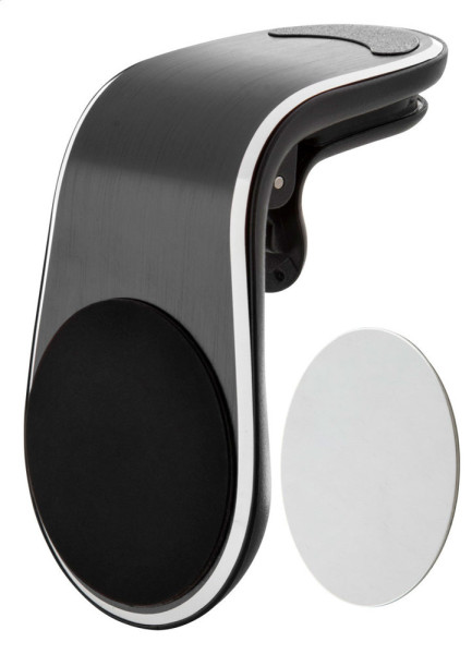 Aluminium, magnetic car mobile holder with air vent mounting. Including self-adhesive metal plate.