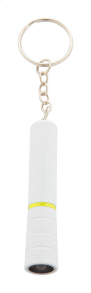 Plastic, mini flashlight with 1 LED and metal keyring. With button cell battery.