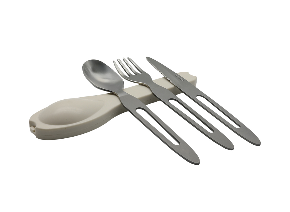 Food-grade 420 stainless steel travel cutlery set. Micro-serrated blade knife, fork, and spoon. Dishwasher safe. PU leather sheath and white ABS storage case included.