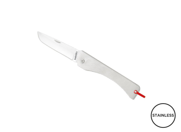 Extra flat folding pocket knife with a 420 stainless steel blade. Bail with a double function: locking the blade in the closed position and serving as a support for hanging it on a keychain.