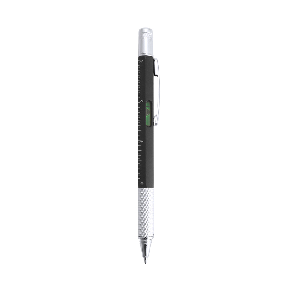 Multi-tool ball pen 4-in-1 with twist mechanism, in varied colors and with soft grip. With built-in level in body, ruler with metric system in centimeters/inches and double-head screwdriver -flat and star-shaped. With metallic clip and blue ink.