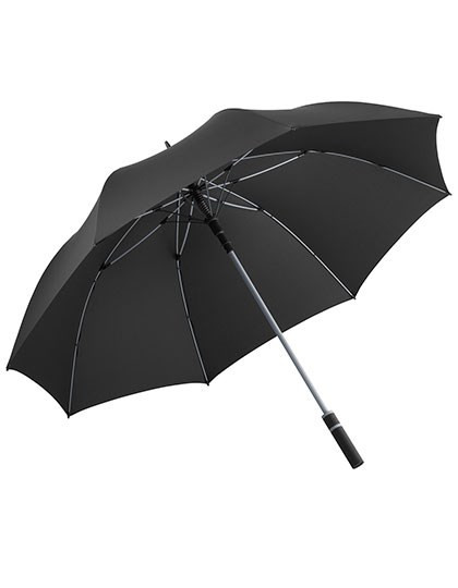 Convenient automatic function for quick opening | High-quality windproof system for maximum frame flexibility in stronger gusts of wind | Flexible fibreglass ribs | Robust steel shaft with coloured plastic casing | Canopy: 100% polyester pongee (recycled & waterSAVE®) | Straight soft-touch handle with coloured grip rings and dual promotional labelling option | Plastic handle