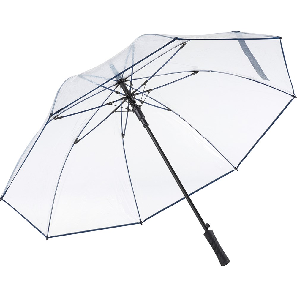 Attractive automatic golf umbrella for two people with transparent cover and coloured details Convenient automatic function for quick opening, high-quality Windproof PLUS system for maximum frame flexibility in stormy conditions, flexible fibreglass ribs, colour-coordinated design elements, straight matt black plastic handle with promotional labelling option, higher corrosion protection due to galvanized steel shaft