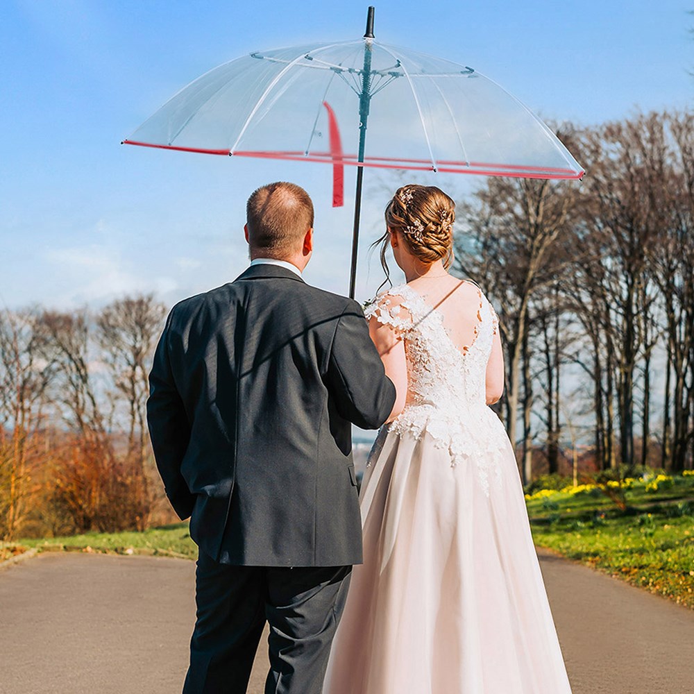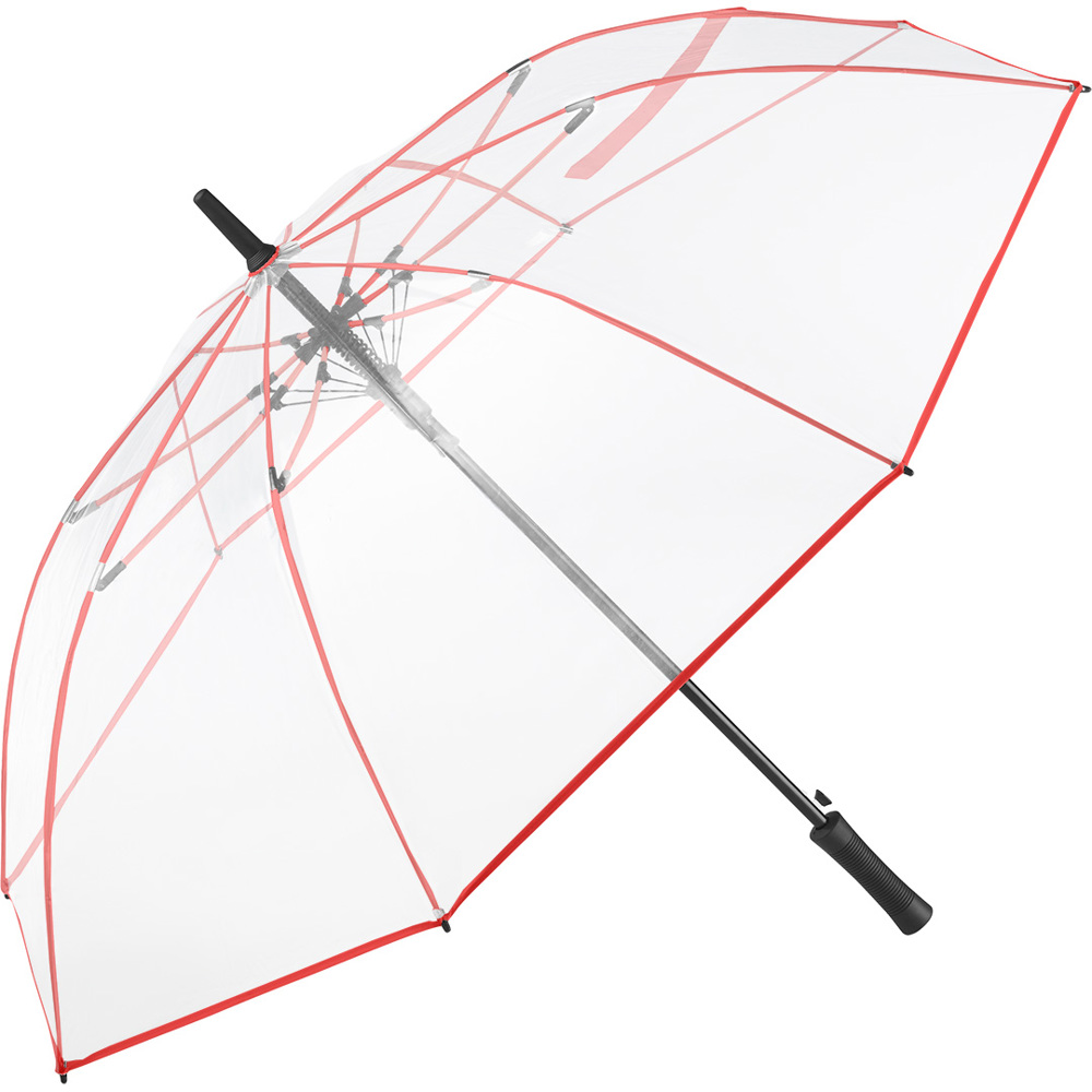 Attractive automatic golf umbrella for two people with transparent cover and coloured details Convenient automatic function for quick opening, high-quality Windproof PLUS system for maximum frame flexibility in stormy conditions, flexible fibreglass ribs, colour-coordinated design elements, straight matt black plastic handle with promotional labelling option, higher corrosion protection due to galvanized steel shaft
