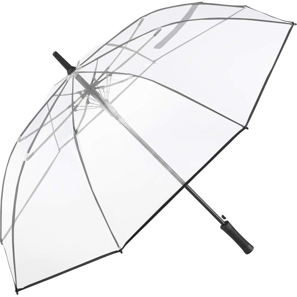 Attractive automatic golf umbrella for two people with transparent cover and coloured details Convenient automatic function for quick opening, high-quality Windproof PLUS system for maximum frame flexibility in stormy conditions, flexible fibreglass ribs, colour-coordinated design elements, straight matt black plastic handle with promotional labelling option, higher corrosion protection due to galvanized steel shaft