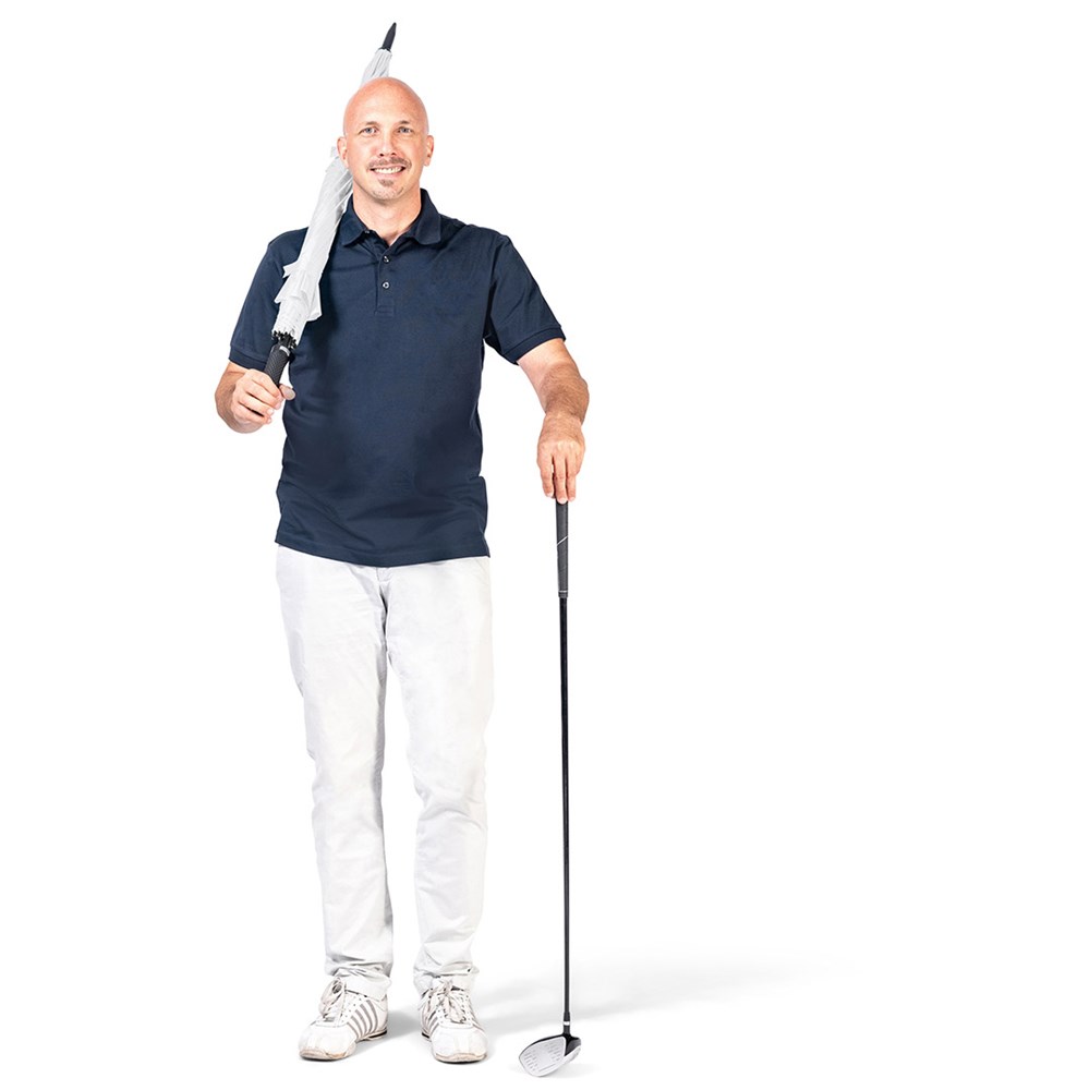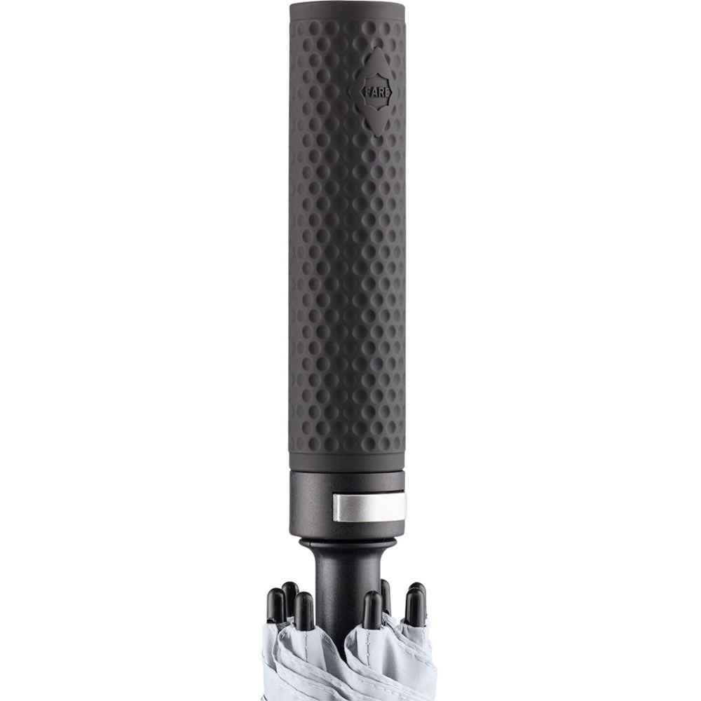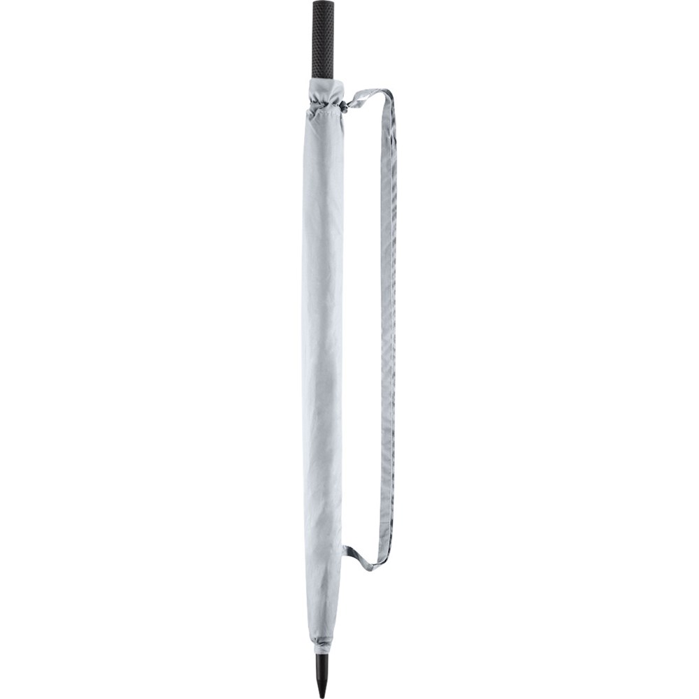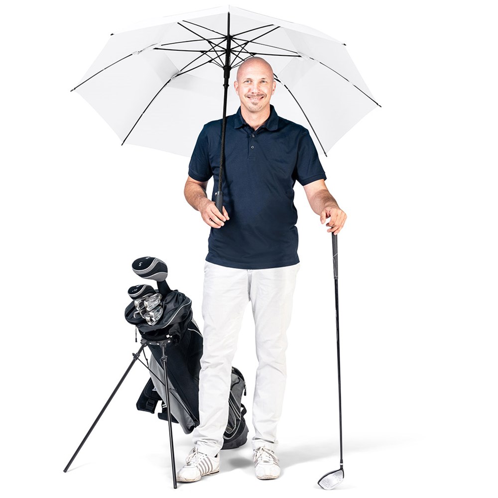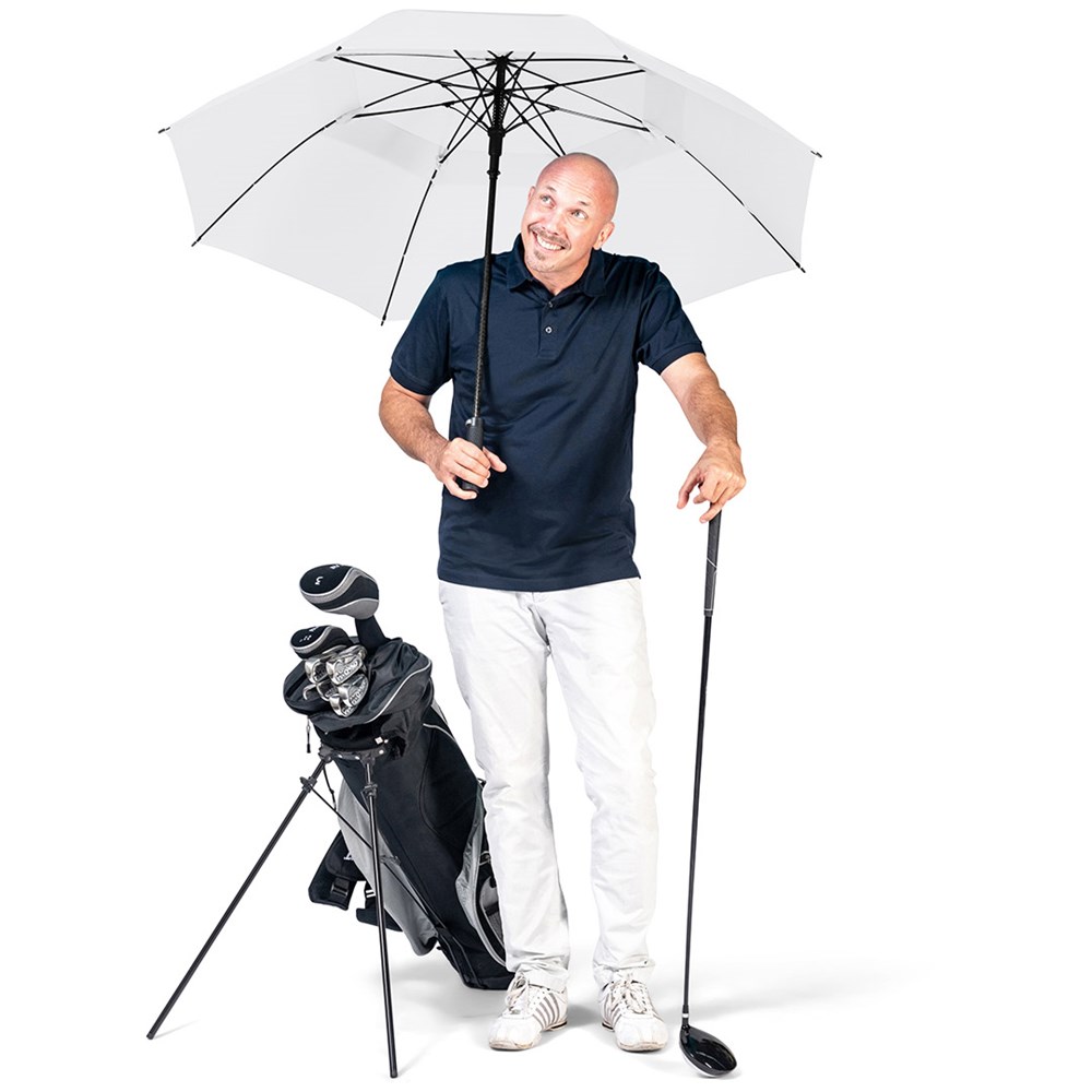 Exclusive automatic golf umbrella for two people with handle in golf design Convenient automatic function for quick opening, high-quality Windproof PLUS system for maximum frame flexibility in stormy conditions, sturdy fibreglass shaft, flexible fibreglass ribs, overlapping ventilation cover to regulate pressure in stronger gusts, cover with two closing straps for optimal fixation in closed state, exclusive Soft-Touch handle with golf ball dimpled surface, silver push-button and promotional labelling option, convenient carry case with shoulder strap, large, accommodating diameter