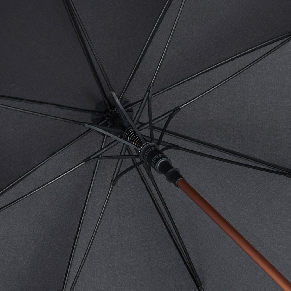 Classy automatic golf umbrella for two peolple with metallic coloured details Convenient automatic function for quick opening, high-quality Windproof PLUS system for maximum frame flexibility in stormy conditions, flexible fibreglass ribs, aluminium shaft with dull metallic colour, matching metal tips, closing strap with noticeable metal press button, matt / shiny contrasting Soft-Feel handle with integrated push-button and promotional labelling option