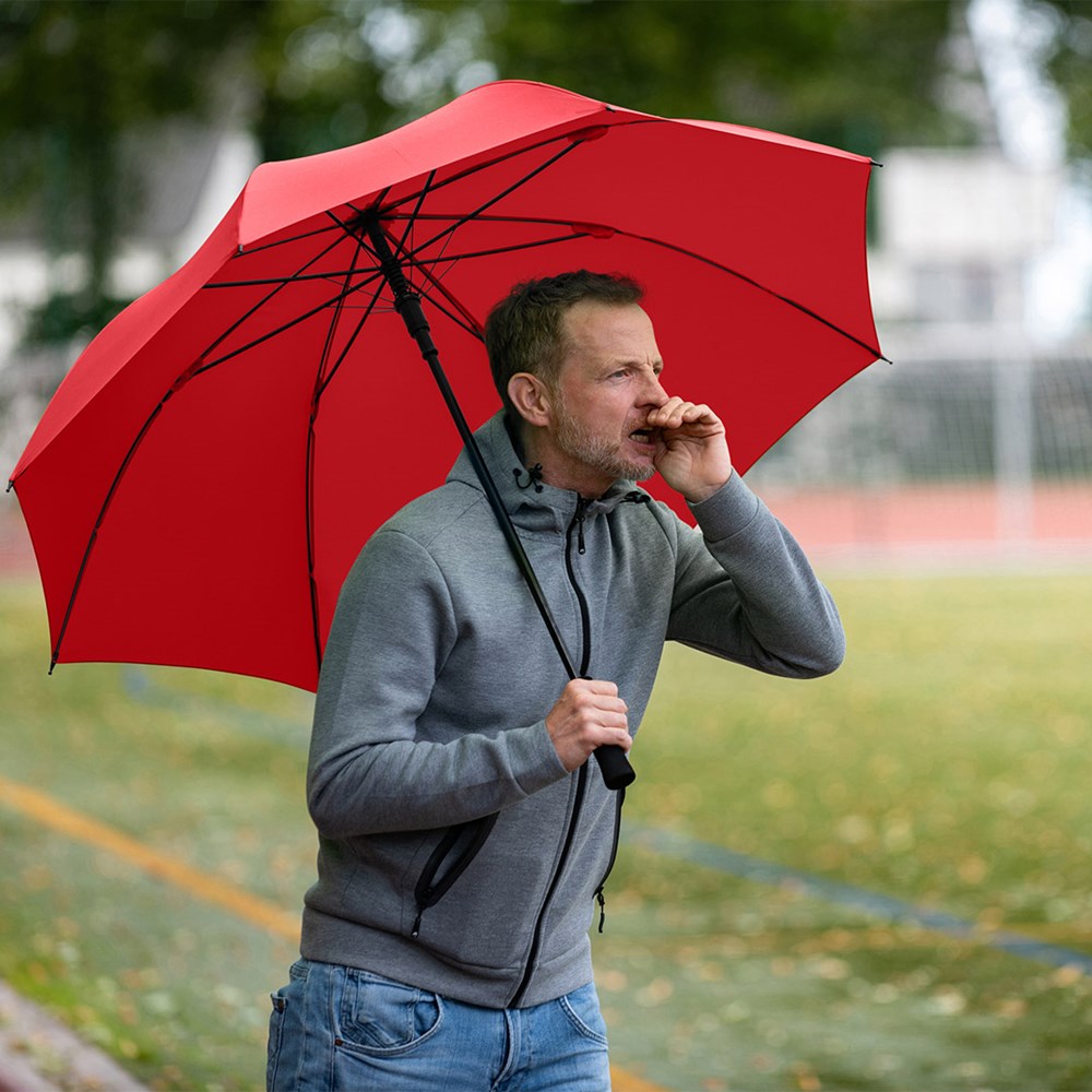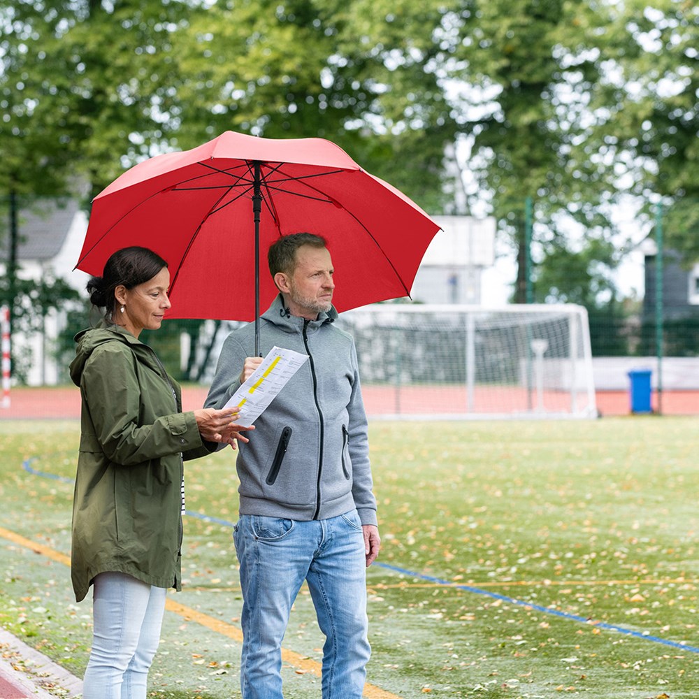 Convenient automatic golf umbrella for two people with hand friendly soft handle Convenient automatic function for quick opening, Windproof system for higher flexibility and stability in windy conditions, flexible fibreglass ribs, straight soft handle, higher corrosion protection due to galvanized steel shaft, large, accommodating diameter