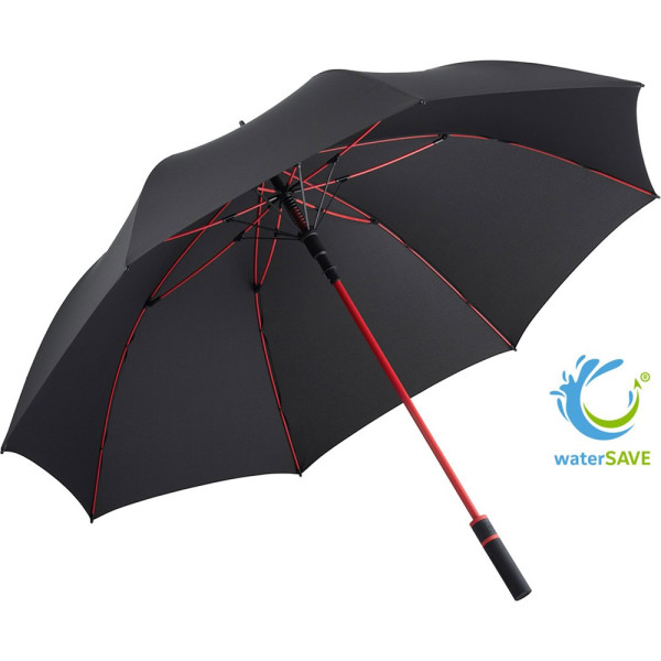 Stylish automatic golf umbrella for two people with coloured shaft and coloured elements Convenient automatic function for quick opening, high-quality Windproof PLUS system for maximum frame flexibility in stormy conditions, flexible fibreglass ribs, stable steel shaft with coloured plastic tube, polyester pongee material made of recycled plastics, eco-friendly thanks to original waterSAVE cover material, with waterSAVE® label on the closing strap, exclusive straight Soft-Feel handle with coloured handle rings and double promotional labelling option. Also available as mini umbrella (art. 5084, 5484, 5584) and as midsize umbrella (art. 4784).