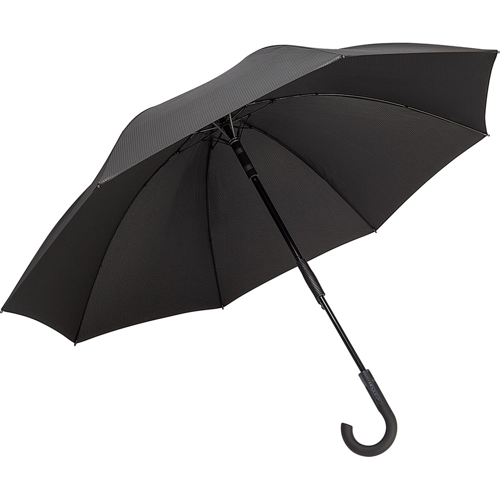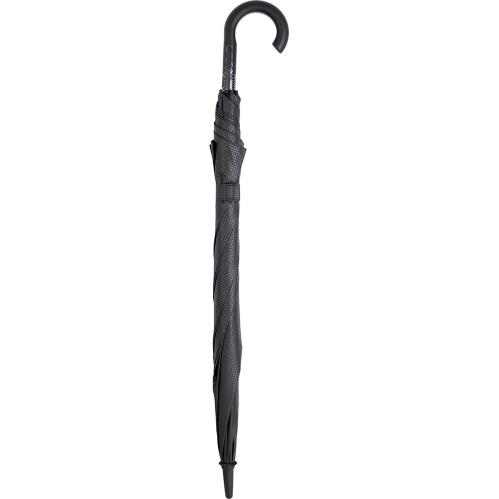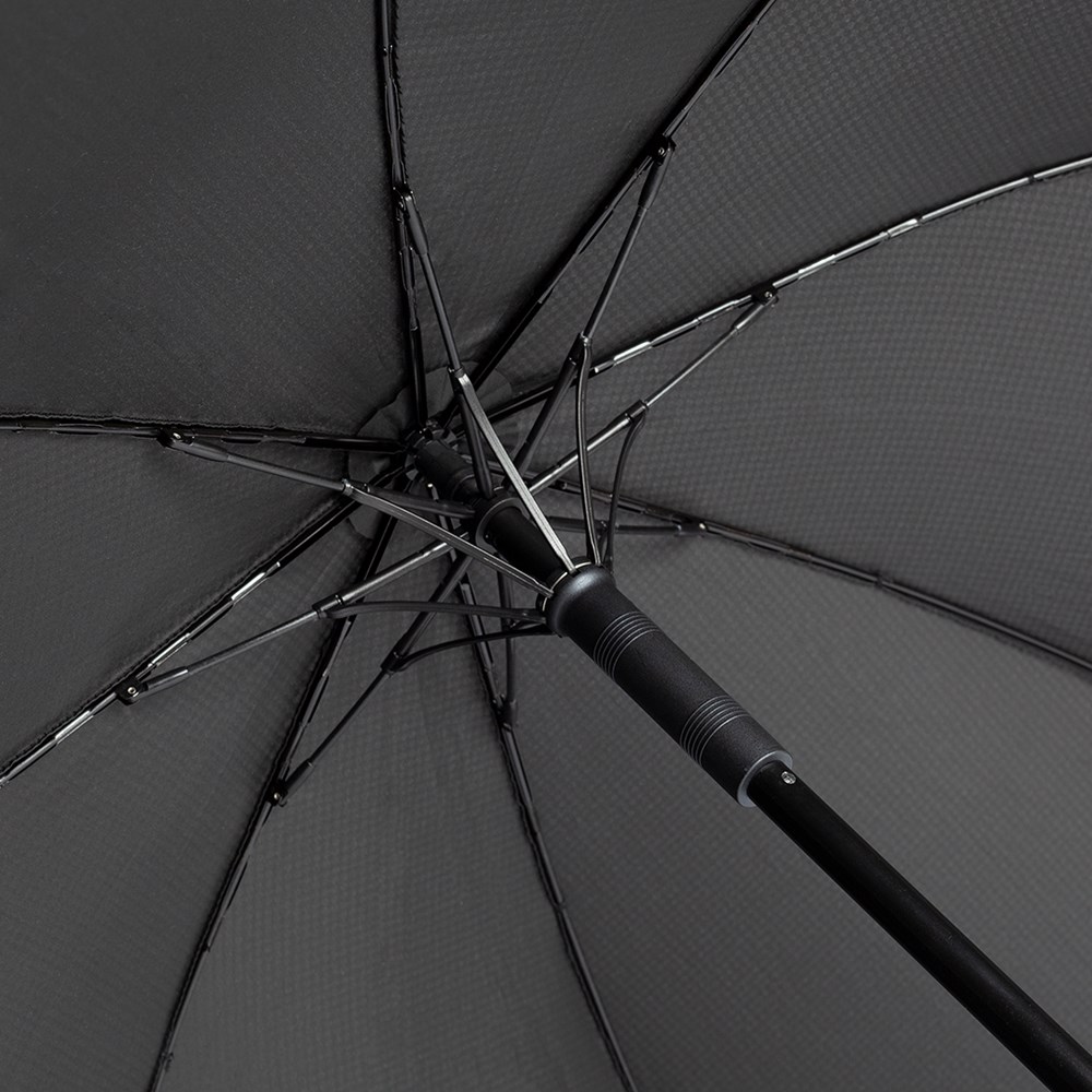 Sporty automatic golf umbrella for two people with shortened closing mechanism and handle in noble carbon look Convenient automatic function for quick opening, high-quality Windproof PLUS system for maximum frame flexibility in stormy conditions, flexible fibreglass ribs, stable steel shaft with shortened closing mechanism for more comfortable closing, polyester Pongee waterSAVE® cover material made of recycled plastics and dyed using a water-saving process, with waterSAVE® label on the closing strap (with new deliveries), cover in elegant tone-in-tone embossed design, stylish Soft-Touch crook handle with details in carbon look, integrated pushbutton and promotional labelling option.