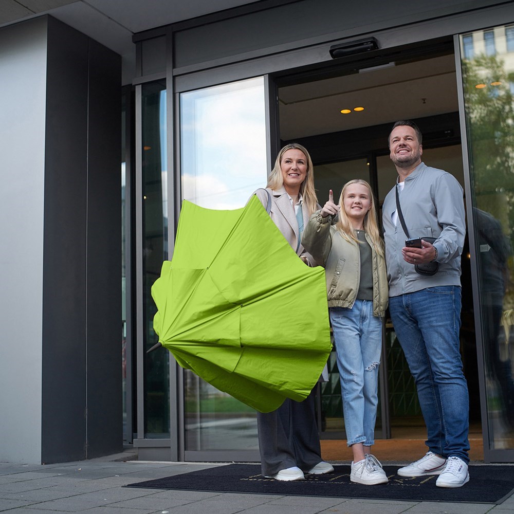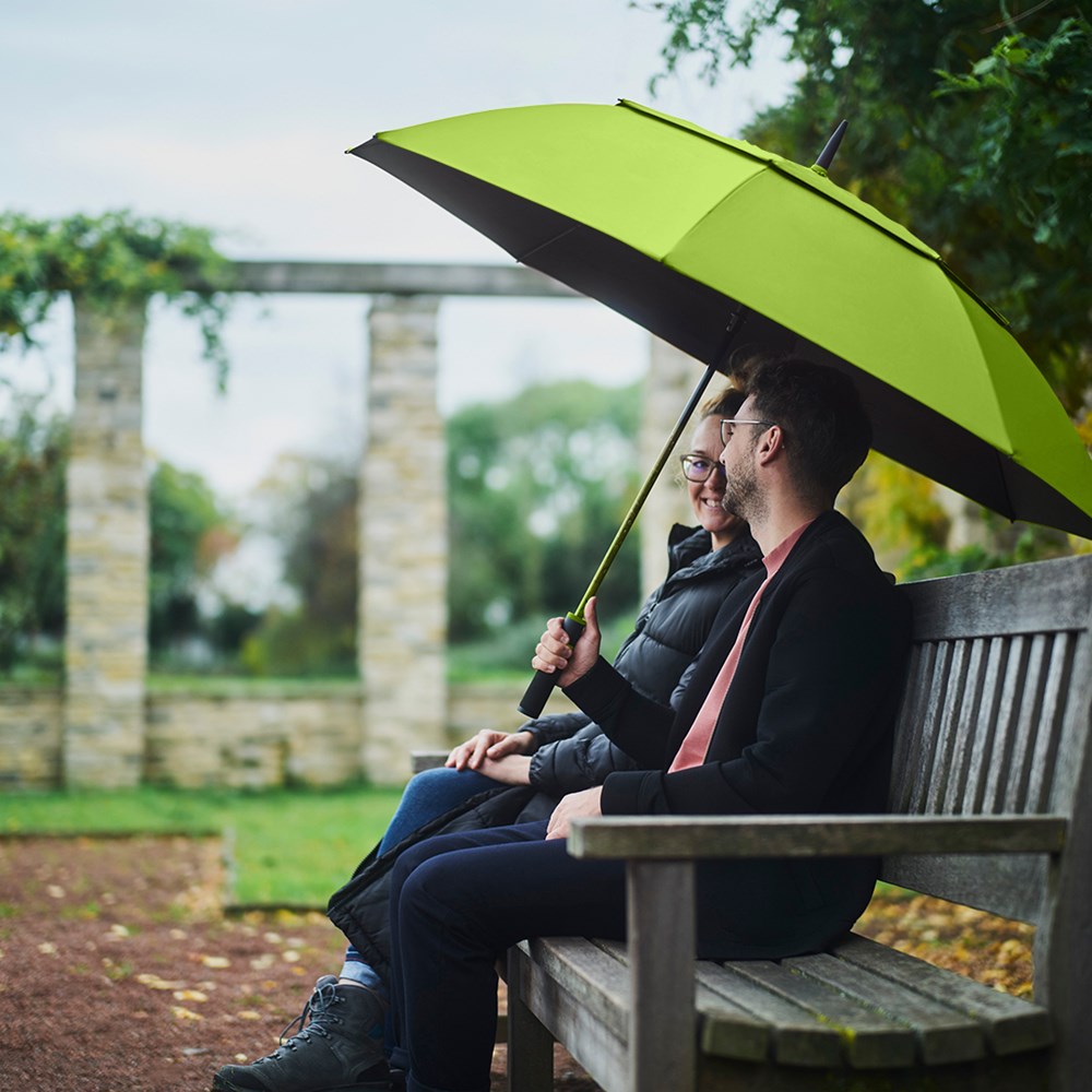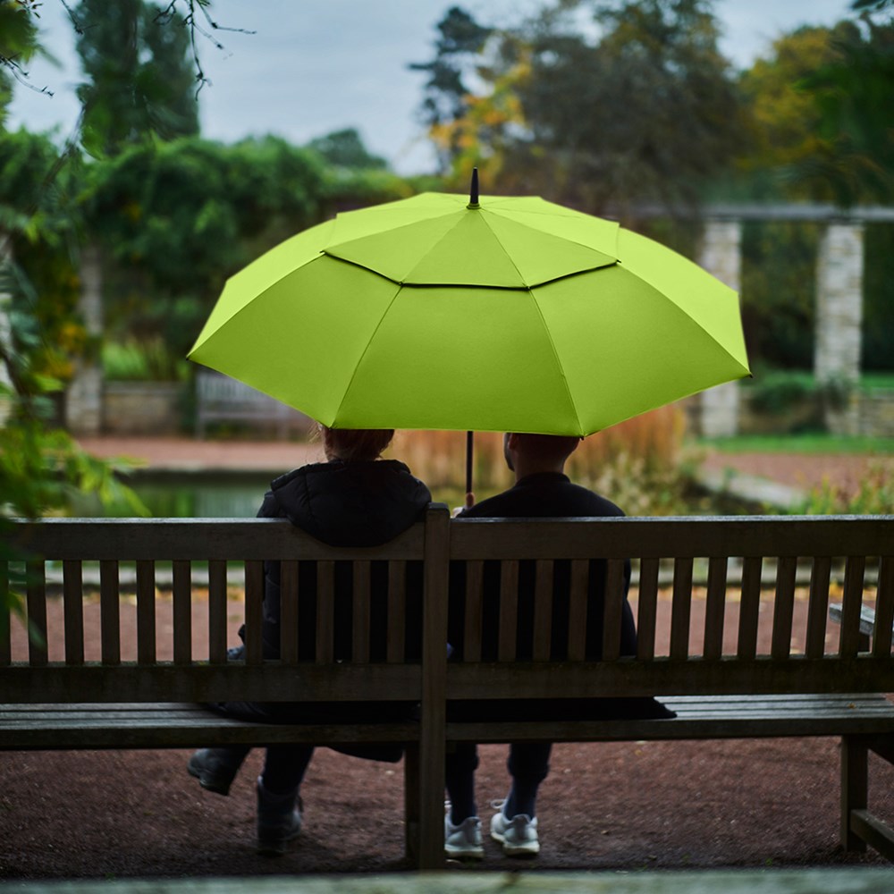 Exclusive automatic golf umbrella for two people with drop motif on the fibreglass shaft Convenient automatic function for quick opening, high-quality Windproof PLUS system for maximum frame flexibility in stormy conditions, flexible fibreglass ribs, stable fibreglass shaft with drop motif, polyester Pongee waterSAVE® cover material made of recycled plastics and dyed using a water-saving process, with waterSAVE® label on the closing strap (with new deliveries), cover coated on the inside, overlapping ventilation cover to regulate pressure in stronger gusts, exclusive soft handle with coloured handle rings, integrated pushbutton and promotional labelling option, drop motif and handle rings colour-coordinated with the cover.