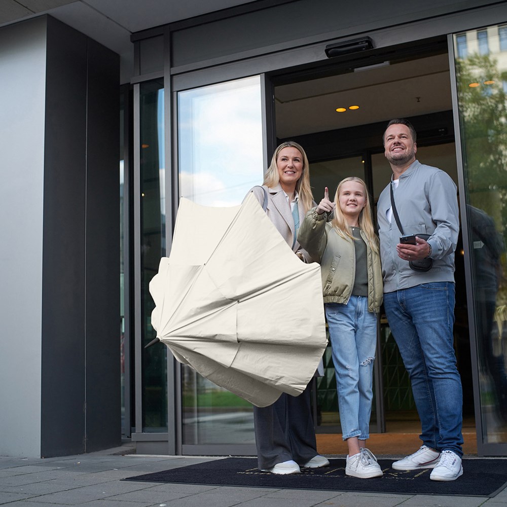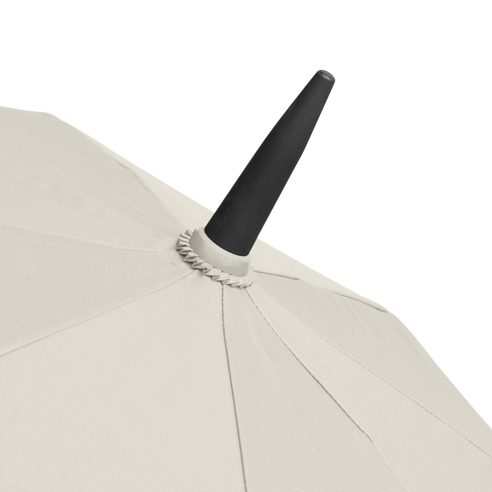 Exclusive automatic golf umbrella for two people with drop motif on the fibreglass shaft Convenient automatic function for quick opening, high-quality Windproof PLUS system for maximum frame flexibility in stormy conditions, flexible fibreglass ribs, stable fibreglass shaft with drop motif, polyester Pongee waterSAVE® cover material made of recycled plastics and dyed using a water-saving process, with waterSAVE® label on the closing strap (with new deliveries), cover coated on the inside, overlapping ventilation cover to regulate pressure in stronger gusts, exclusive soft handle with coloured handle rings, integrated pushbutton and promotional labelling option, drop motif and handle rings colour-coordinated with the cover.