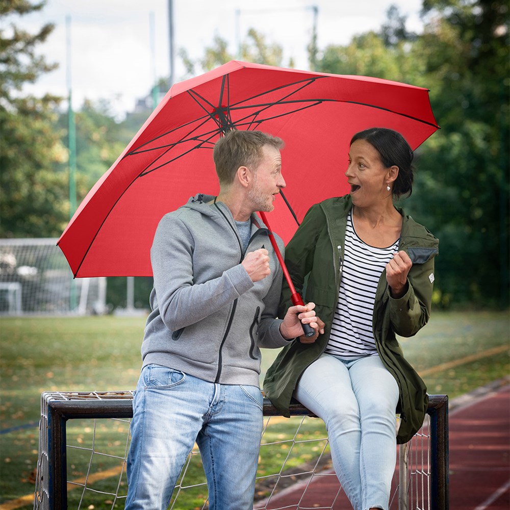 Square shape golf umbrella for two people Convenient automatic function for quick opening, high-quality Windproof PLUS system for maximum frame flexibility in stormy conditions, flexible fibreglass ribs, coloured tube over the steel shaft, straight Soft-Touch handle with integrated push button and double promotional labelling option, large, accommodating diameter