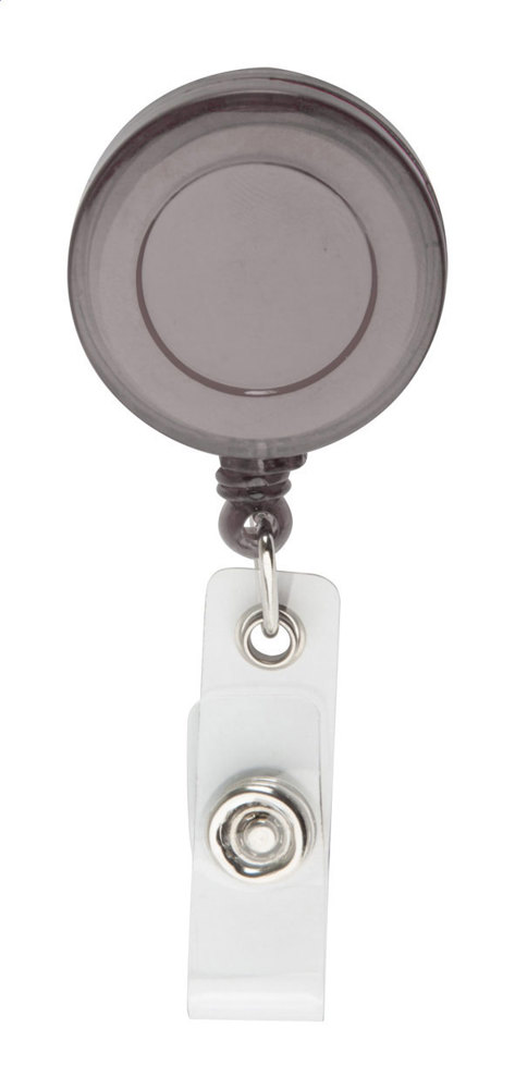 Plastic badge holder with press-stud closure, telescopic line and metal clip.