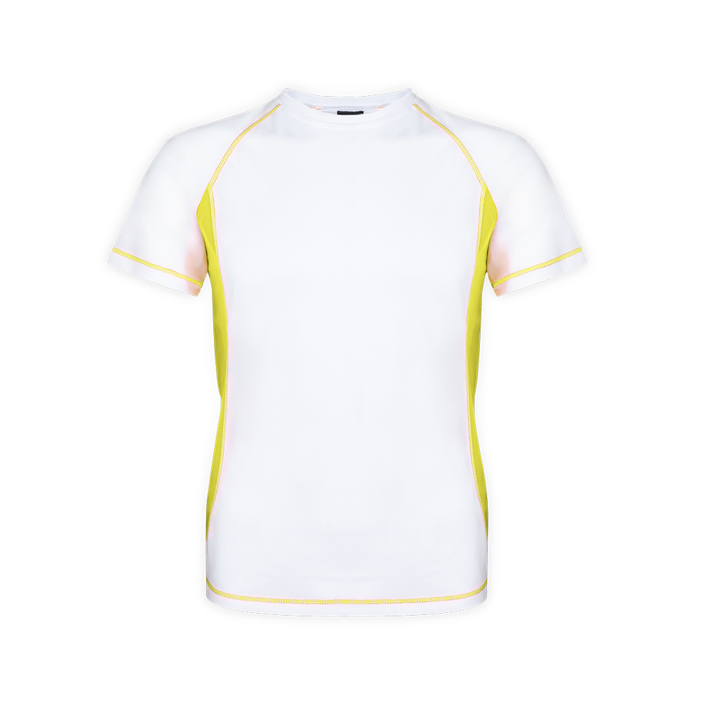Technical t-shirt for adult in 100% breathable polyester material of 135g/m2. Design in white with reinforcement seams and brightly colored sides. Available in sizes S, M, L, XL, XXL.