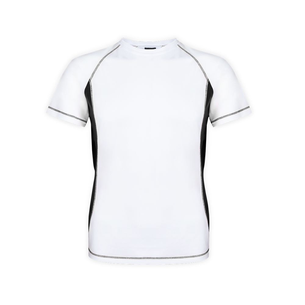 Technical t-shirt for adult in 100% breathable polyester material of 135g/m2. Design in white with reinforcement seams and brightly colored sides. Available in sizes S, M, L, XL, XXL.