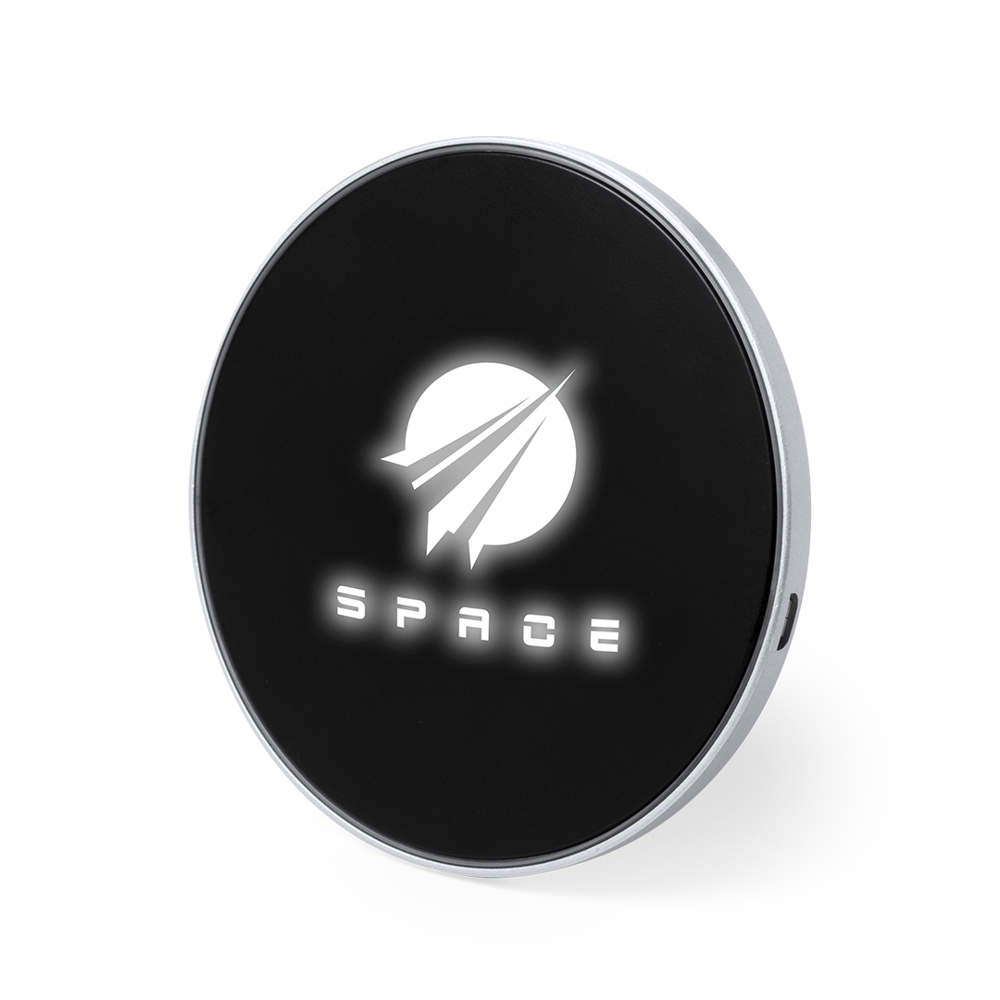 Round design, wireless charger. Inside LED light and body especially designed for laser printing, illuminating the logo. With non-slip base, compatible with devices equipped with wireless charging technology and presented in an attractive design box. USB cable included.