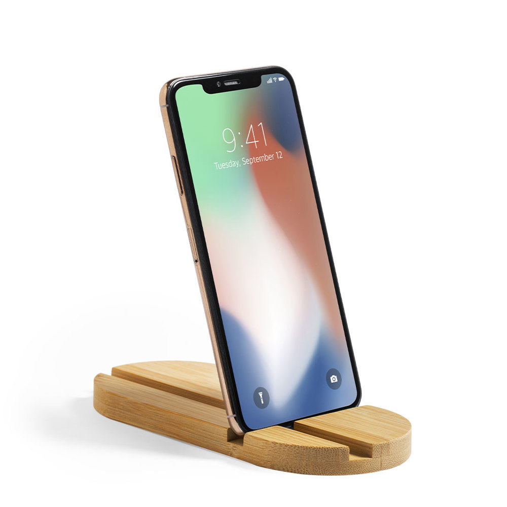 Unique and simple nature line holder for smartphone and tablet. Made of bamboo from natural cuttings. Presented in an attractive individual box with an eco-friendly design.