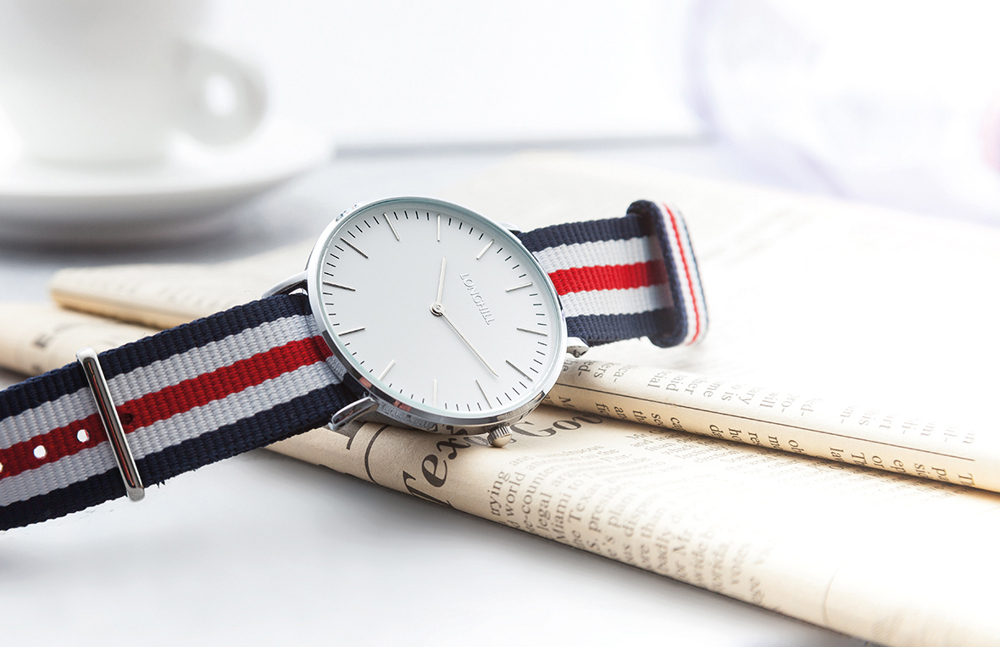 Features: case depth: 7,50 mm, movement: VX50, white dial, hands silver, stainless steel back, 3 ATM water resistant, textile strap 22 mm navy/white/red