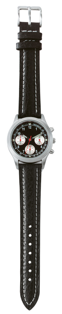 Features: case depth: 9,5 mm, movement: VD 54, black dial white numerals, hour lines white/luminous, stainless steel back, 3 ATM waterproof, genuine leather strap, padded, black 18 mm, numerals hr/min hands 4 silver /luminous, red sec, silver subsidiary dials, black numerals red hands