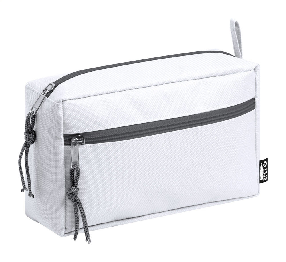 RPET cosmetic bag with two zipped compartments, 600D RPET polyester. With distinctive RPET label.