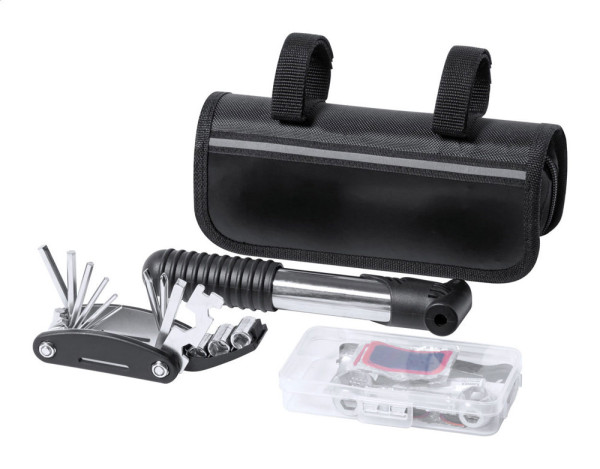 Fahrrad-Reparaturset im praktischem Fahrradrahmenetui (600D Polyester). Beinhaltet: Multitool mit 15 Funktionen, Sechskantschlüssel, Mini-Pumpe und Reifenpannen-Reparaturkit (2 Reifenheber, Schleifpapier und 6 Reifenflicken).