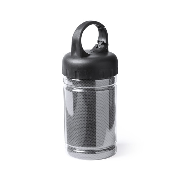 Handtuch mit den Maßen 90 x 30 cm aus kühlendem SoftCool-Extreme-Material (160 g/m2) mit UV-50-Schutz. Präsentiert in einem transparenten Gehäuse mit Deckel und Tragegriff sowie integrierten Befestigungskarabiner.