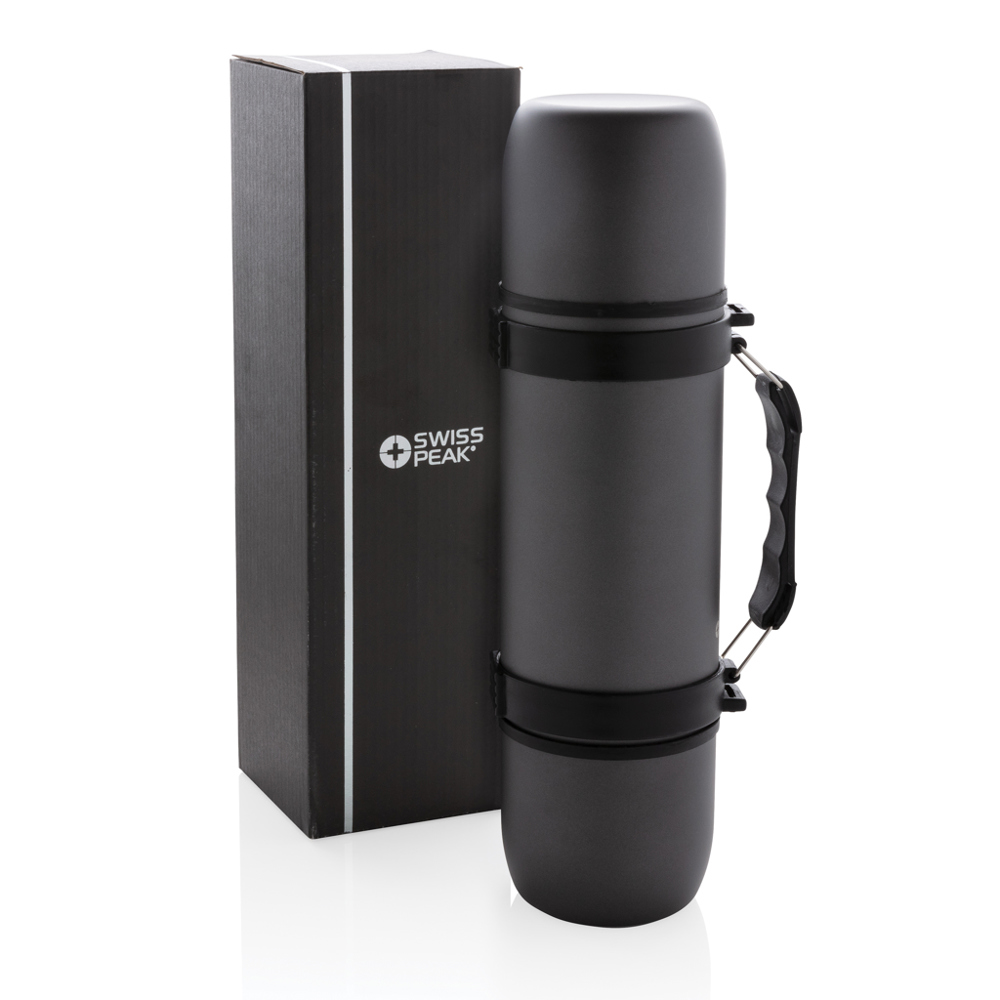 Doppelwandige Stainless-Steel Thermosflasche in elegantem Design mit Griff und Schultergurt sowie 2 passenden Tassen. Auslaufsicher, nur Handwäsche. Inhalt: 700ml.
