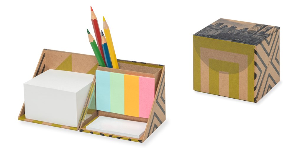 Hardcover Box 8 x7,5x7,5 cm - Druck 4/4c Druck Cover in CMYK Maße geschlossen - seitlich aufklappbar Ummantlung aus braunem Kraftpapier Druckbild aufgrund des braunem Papiers abweichend zu Druck auf weißem Papier keine zusätzliche Folien-Kaschierung links innen mit Notizblock - hinten geleimt 7 ,2x6,5 cm - ca. 380 Blatt - Druck 1-2/0c rechts innen mit Haftnotizen - 6,8*x4 cm - 25 Blatt - Druck 1-2/0c Papiere aus recyceltem Papier - 80 gr Papier-Index 18*x50 mm - 4x25 Stück - 4 Standardard-Farben Schreibgeräte-Fach 7,5x2,3x7cm oben offen einzeln mit neutraler Banderole verschlossen VE: 30 Stück im Karton Patentgeschützter Artikel