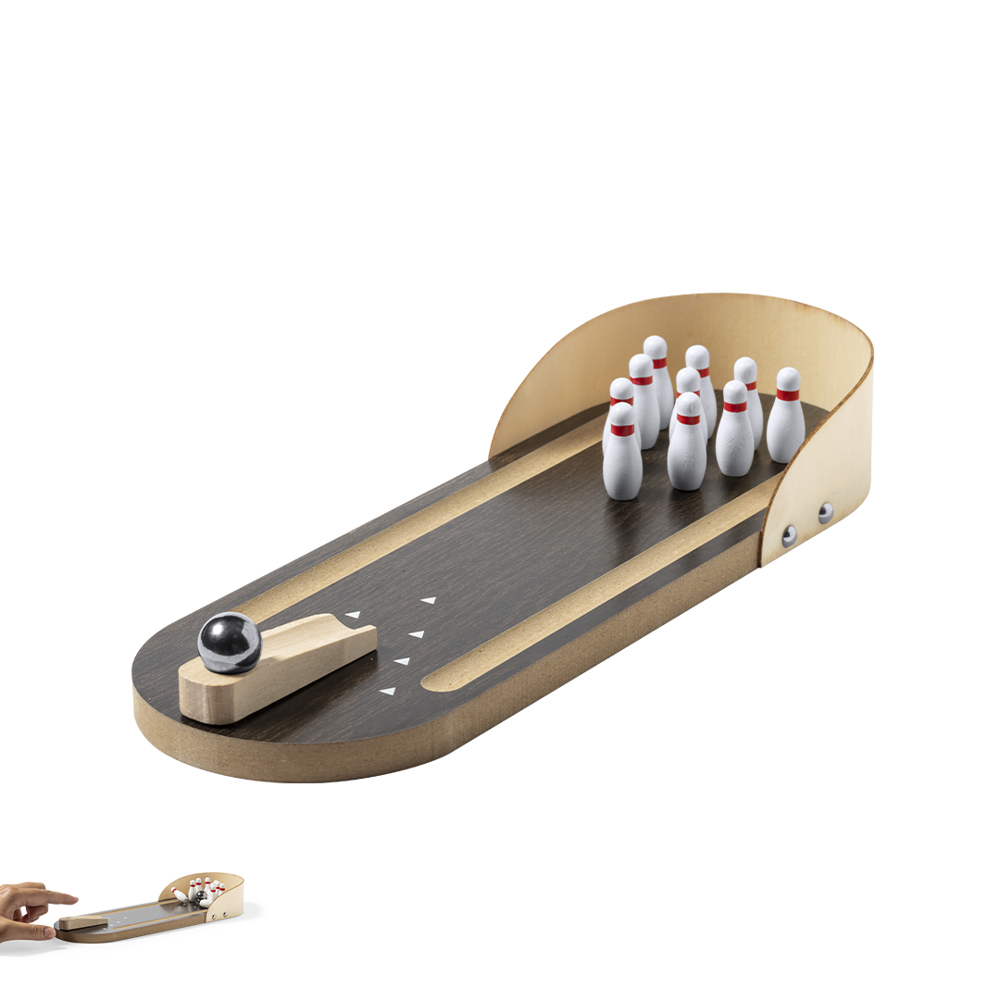 Mini-Bowlingspiel, hergestellt aus widerstandsfähigem Holz. Enthält 10 Pins und Metallkugel, mit verstellbarer Abschussrampe. Testen Sie Ihre Fähigkeiten mit diesem lustigen und süchtig machenden Spiel. Präsentiert in einer attraktiven, individuell gestalteten Box mit Kraftlackierung.