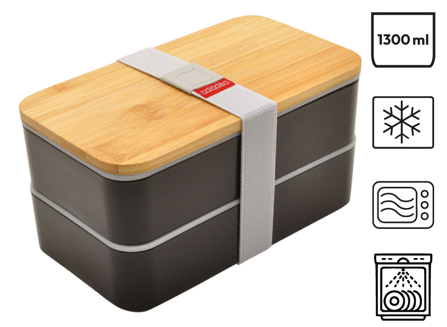Lunchbox mit doppeltem Fach. Zwei Behälter aus Polypropylen und zwei Trennwände aus Polyethylen für eine bessere Abdichtung. Deckel aus Bambus. Kompatibel (ohne Deckel) mit Spülmaschine (max. 50 °C), Gefrierschrank und Mikrowelle (max. 100 °C und 2 Minuten). Fassungsvermögen: 1,3 L.