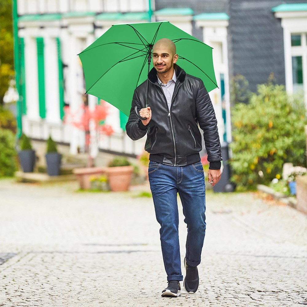 Preislich attraktiver Automatik-Stockschirm mit Windproof-System Komfortable Automatik-Funktion zum schnellen Öffnen, Windproof-System für höhere Gestell-Flexibilität und bessere Windsicherheit, flexible Fiberglasschienen, matt-schwarzer Kunststoff Rundhakengriff, höherer Korrosionsschutz durch schwarze Galvanisierung des Stahlstocks. Auch als Gästeschirm (Art. 2359) erhältlich.