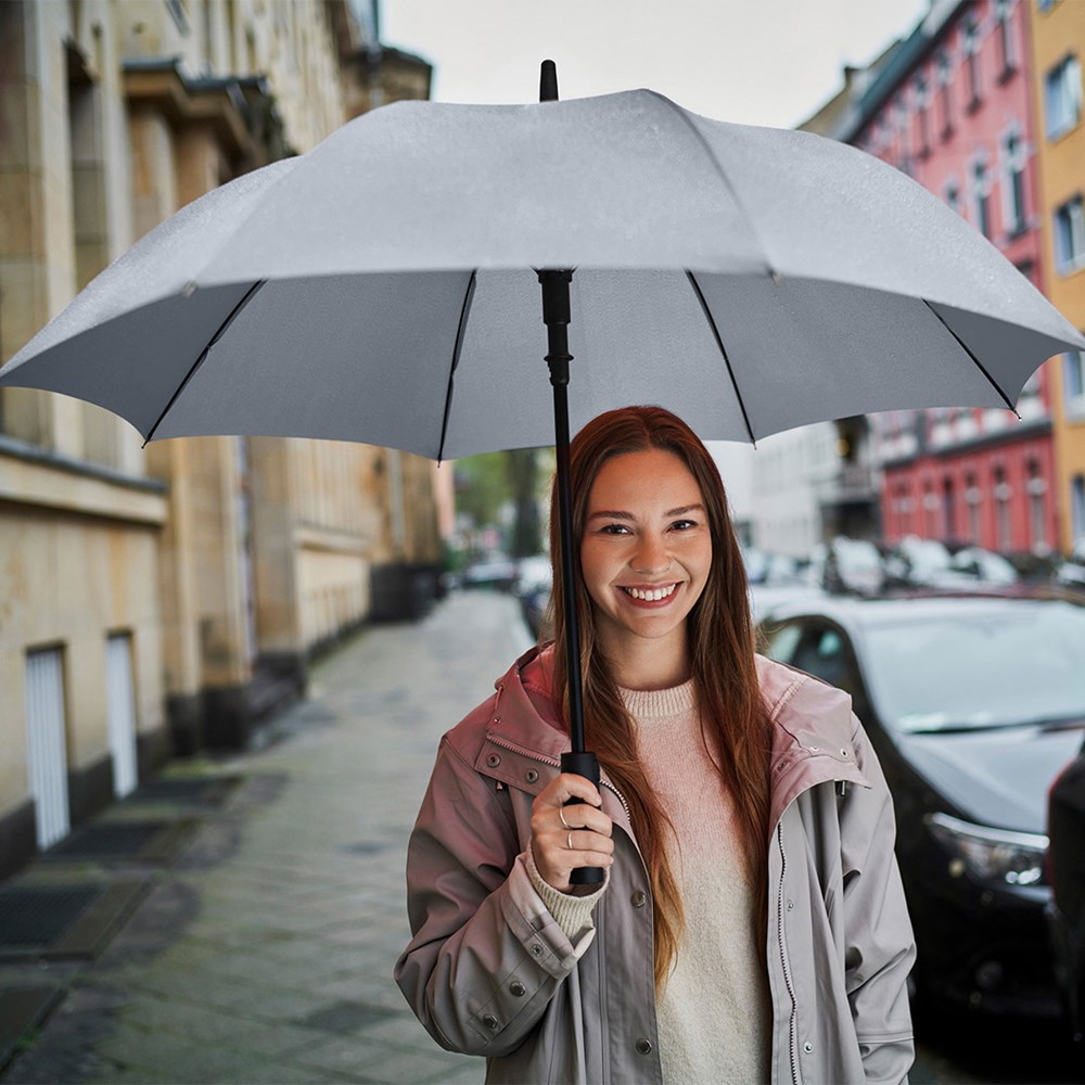 Preislich attraktiver Automatik-Stockschirm mit Windproof-PLUS-System Komfortable Automatik-Funktion zum schnellen Öffnen, hochwertiges Windproof-PLUS-System für eine maximale Gestell-Flexibilität bei stärkeren Windböen, flexible Fiberglasschienen, höherer Korrosionsschutz durch schwarze Galvanisierung des Stahlstocks, handsympathischer Soft-Feel-Griff mit integrierter Auslösetaste und Werbeanbringungsmöglichkeit.