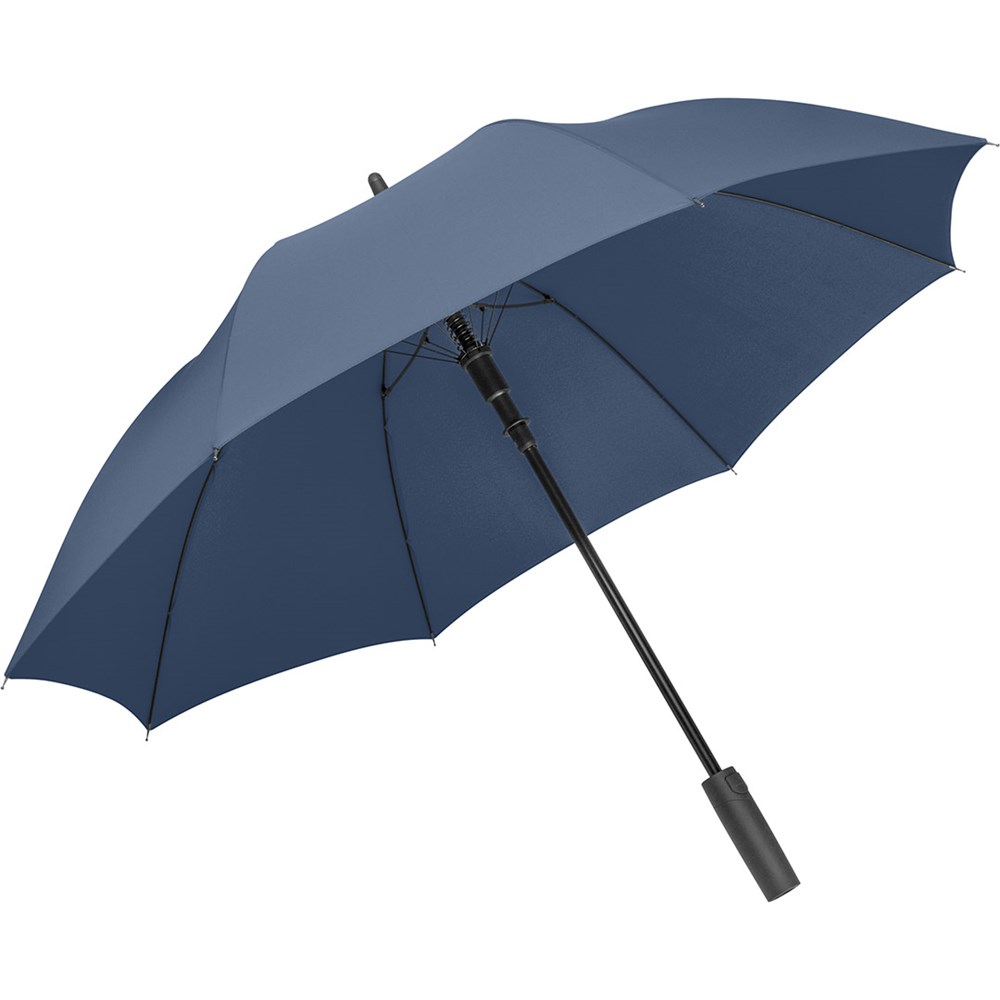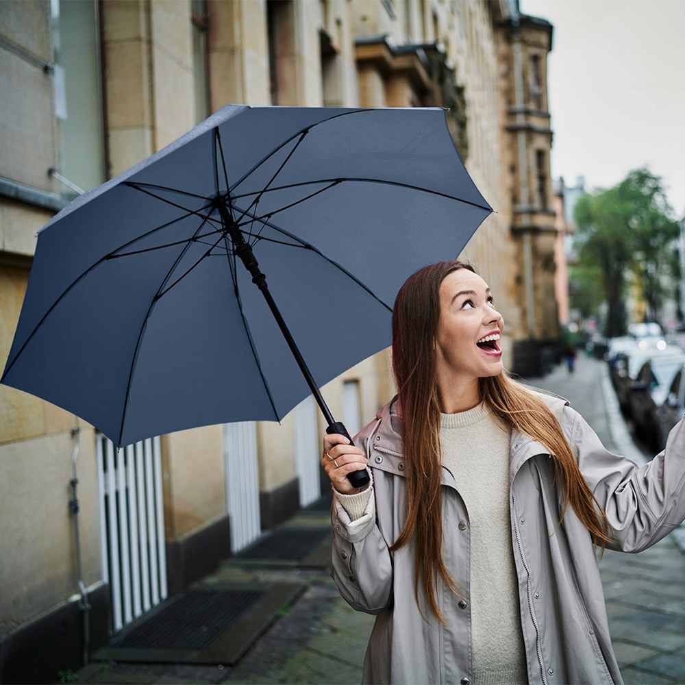 Preislich attraktiver Automatik-Stockschirm mit Windproof-PLUS-System Komfortable Automatik-Funktion zum schnellen Öffnen, hochwertiges Windproof-PLUS-System für eine maximale Gestell-Flexibilität bei stärkeren Windböen, flexible Fiberglasschienen, höherer Korrosionsschutz durch schwarze Galvanisierung des Stahlstocks, handsympathischer Soft-Feel-Griff mit integrierter Auslösetaste und Werbeanbringungsmöglichkeit.