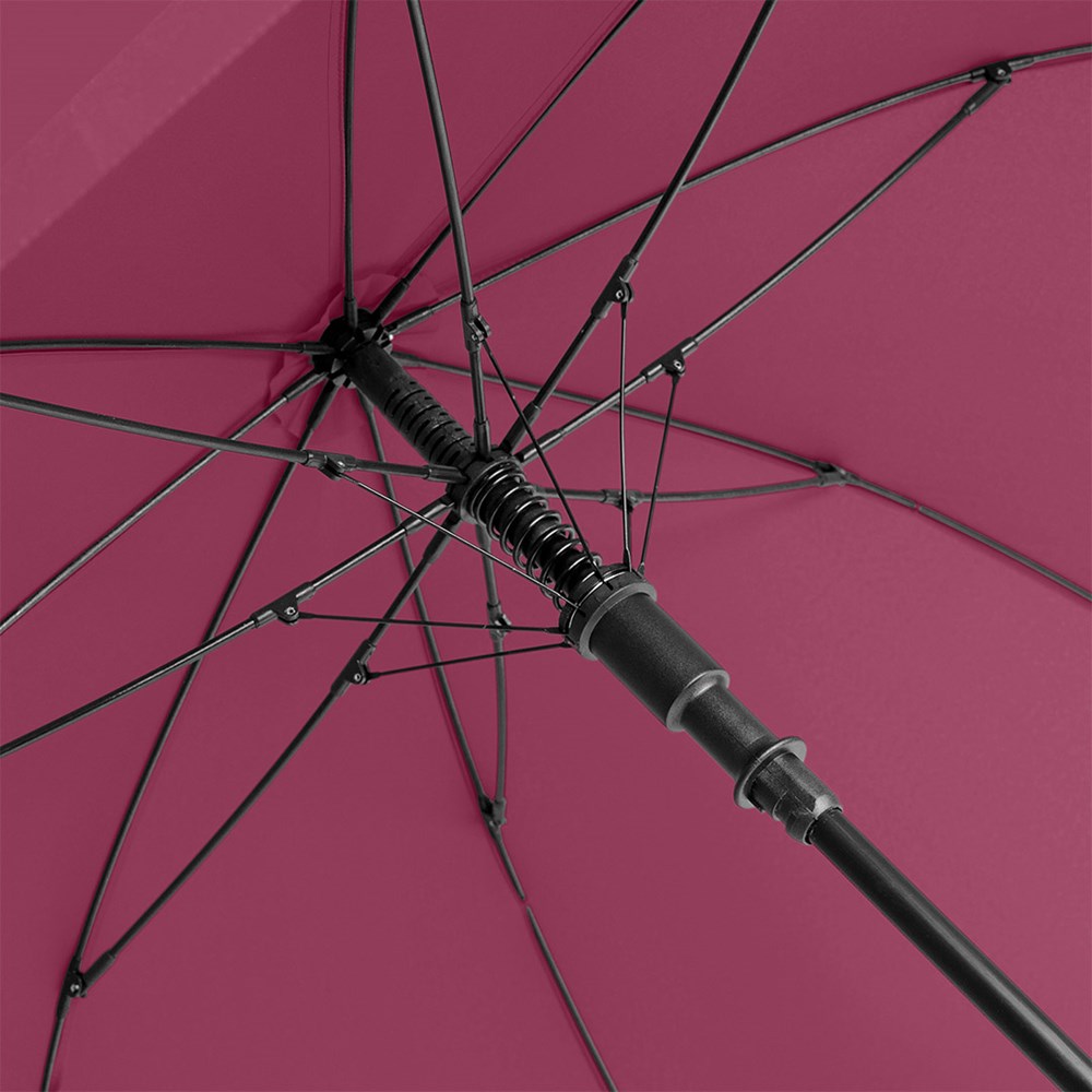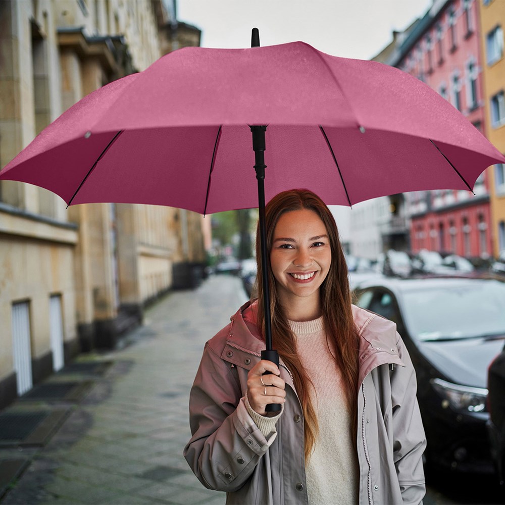 Preislich attraktiver Automatik-Stockschirm mit Windproof-PLUS-System Komfortable Automatik-Funktion zum schnellen Öffnen, hochwertiges Windproof-PLUS-System für eine maximale Gestell-Flexibilität bei stärkeren Windböen, flexible Fiberglasschienen, höherer Korrosionsschutz durch schwarze Galvanisierung des Stahlstocks, handsympathischer Soft-Feel-Griff mit integrierter Auslösetaste und Werbeanbringungsmöglichkeit.