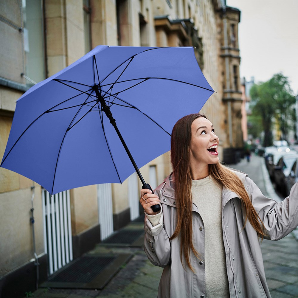 Preislich attraktiver Automatik-Stockschirm mit Windproof-PLUS-System Komfortable Automatik-Funktion zum schnellen Öffnen, hochwertiges Windproof-PLUS-System für eine maximale Gestell-Flexibilität bei stärkeren Windböen, flexible Fiberglasschienen, höherer Korrosionsschutz durch schwarze Galvanisierung des Stahlstocks, handsympathischer Soft-Feel-Griff mit integrierter Auslösetaste und Werbeanbringungsmöglichkeit.