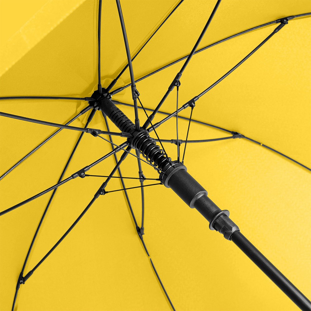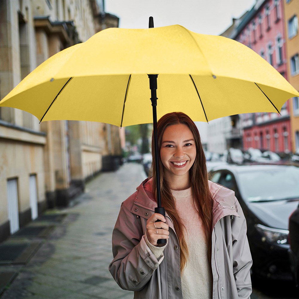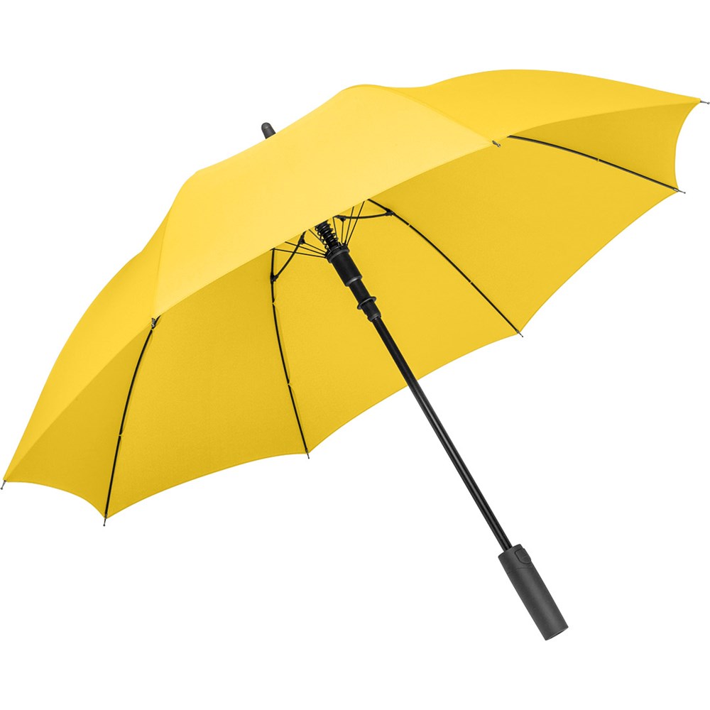 Preislich attraktiver Automatik-Stockschirm mit Windproof-PLUS-System Komfortable Automatik-Funktion zum schnellen Öffnen, hochwertiges Windproof-PLUS-System für eine maximale Gestell-Flexibilität bei stärkeren Windböen, flexible Fiberglasschienen, höherer Korrosionsschutz durch schwarze Galvanisierung des Stahlstocks, handsympathischer Soft-Feel-Griff mit integrierter Auslösetaste und Werbeanbringungsmöglichkeit.