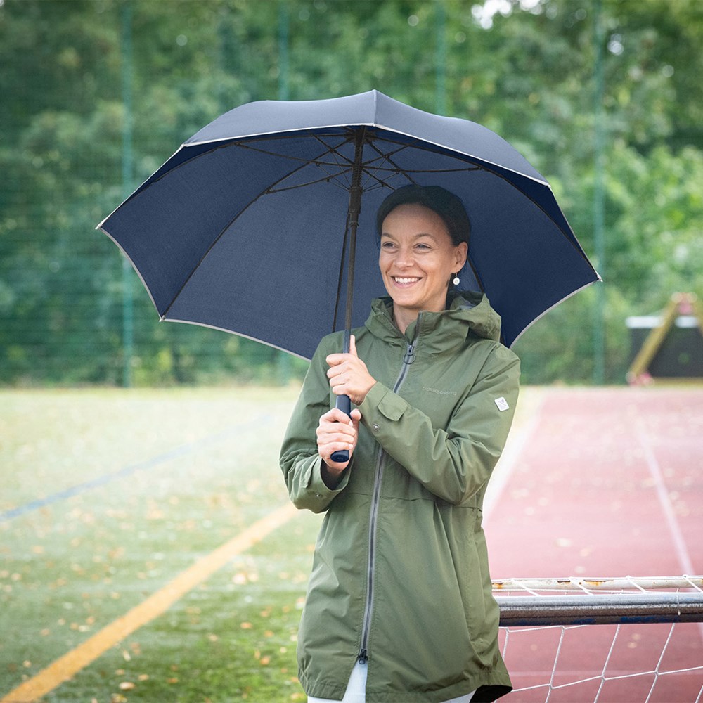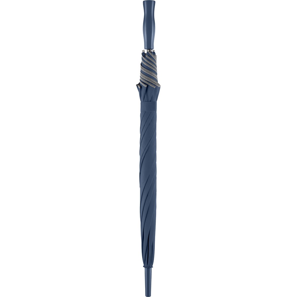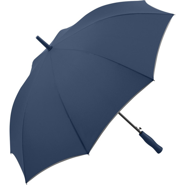 Markanter Automatik-Stockschirm mit modisch reflektierender Paspelierung Komfortable Automatik-Funktion zum schnellen Öffnen, hochwertiges Windproof-PLUS-System für eine maximale Gestell-Flexibilität bei stärkeren Windböen, stabiler Fiberglasstock, flexible Fiberglasschienen, Bezug mit modischer Reflexpaspel in Silber, handsympatischer Soft-Touch-Griff mit Werbeanbringungsmöglichkeit, Soft-Touch-Top
