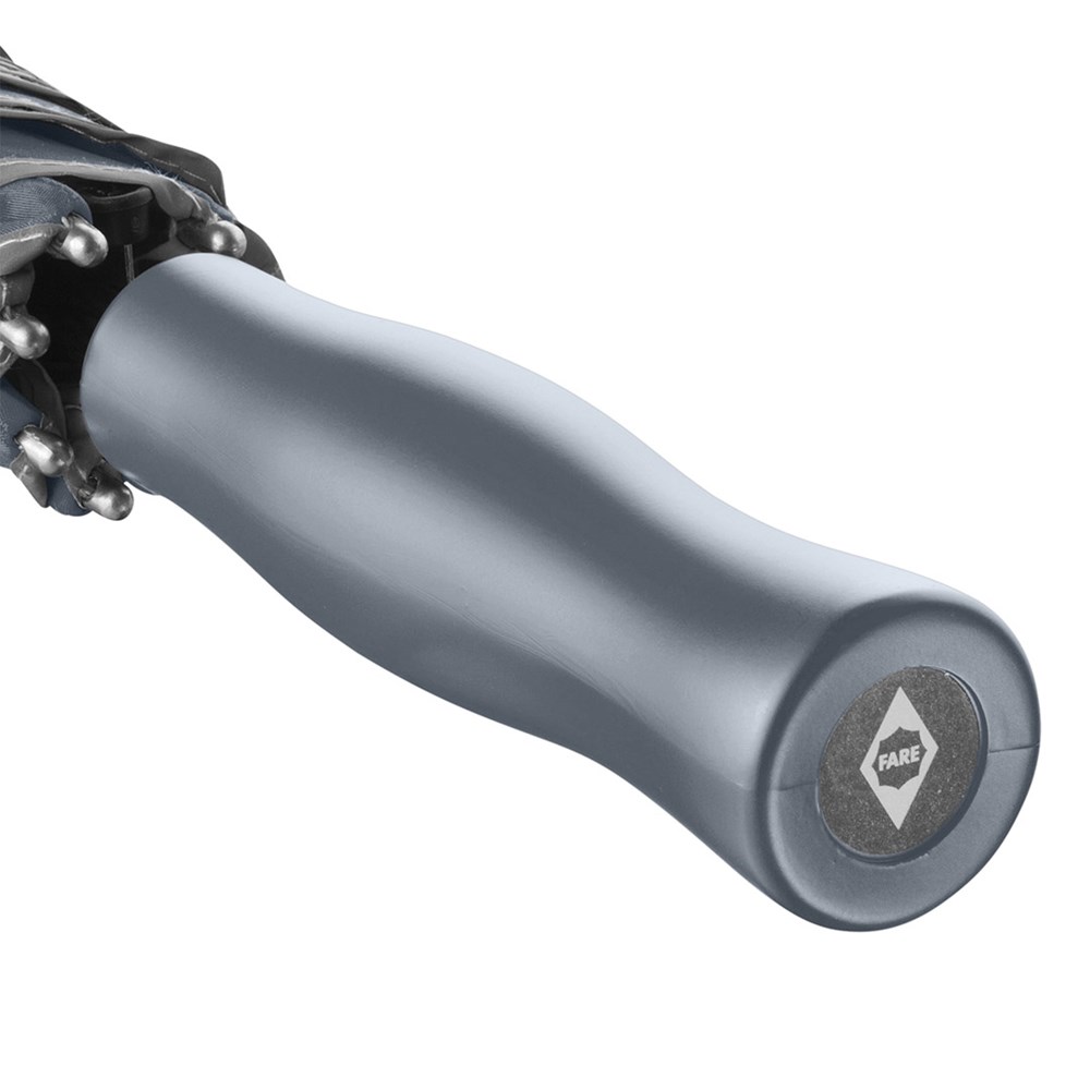 Markanter Automatik-Stockschirm mit modisch reflektierender Paspelierung Komfortable Automatik-Funktion zum schnellen Öffnen, hochwertiges Windproof-PLUS-System für eine maximale Gestell-Flexibilität bei stärkeren Windböen, stabiler Fiberglasstock, flexible Fiberglasschienen, Bezug mit modischer Reflexpaspel in Silber, handsympatischer Soft-Touch-Griff mit Werbeanbringungsmöglichkeit, Soft-Touch-Top