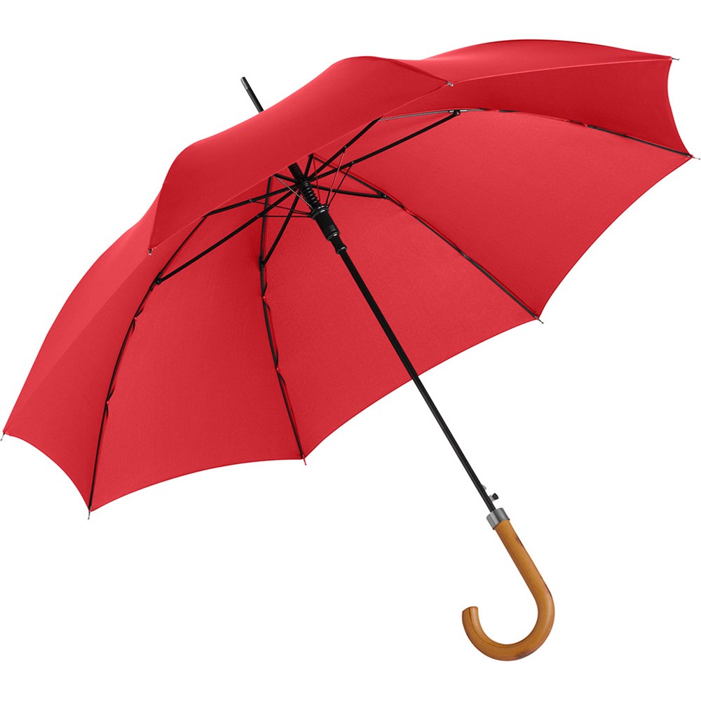 Preislich attraktiver Automatik-Stockschirm mit geflammtem Rundhakengriff aus Echtholz Komfortable Automatik-Funktion zum schnellen Öffnen, Windproof-System für höhere Gestell-Flexibilität und bessere Windsicherheit, flexible Fiberglasschienen, Griff mit laserfähigem Griffring, höherer Korrosionsschutz durch schwarze Galvanisierung des Stahlstocks
