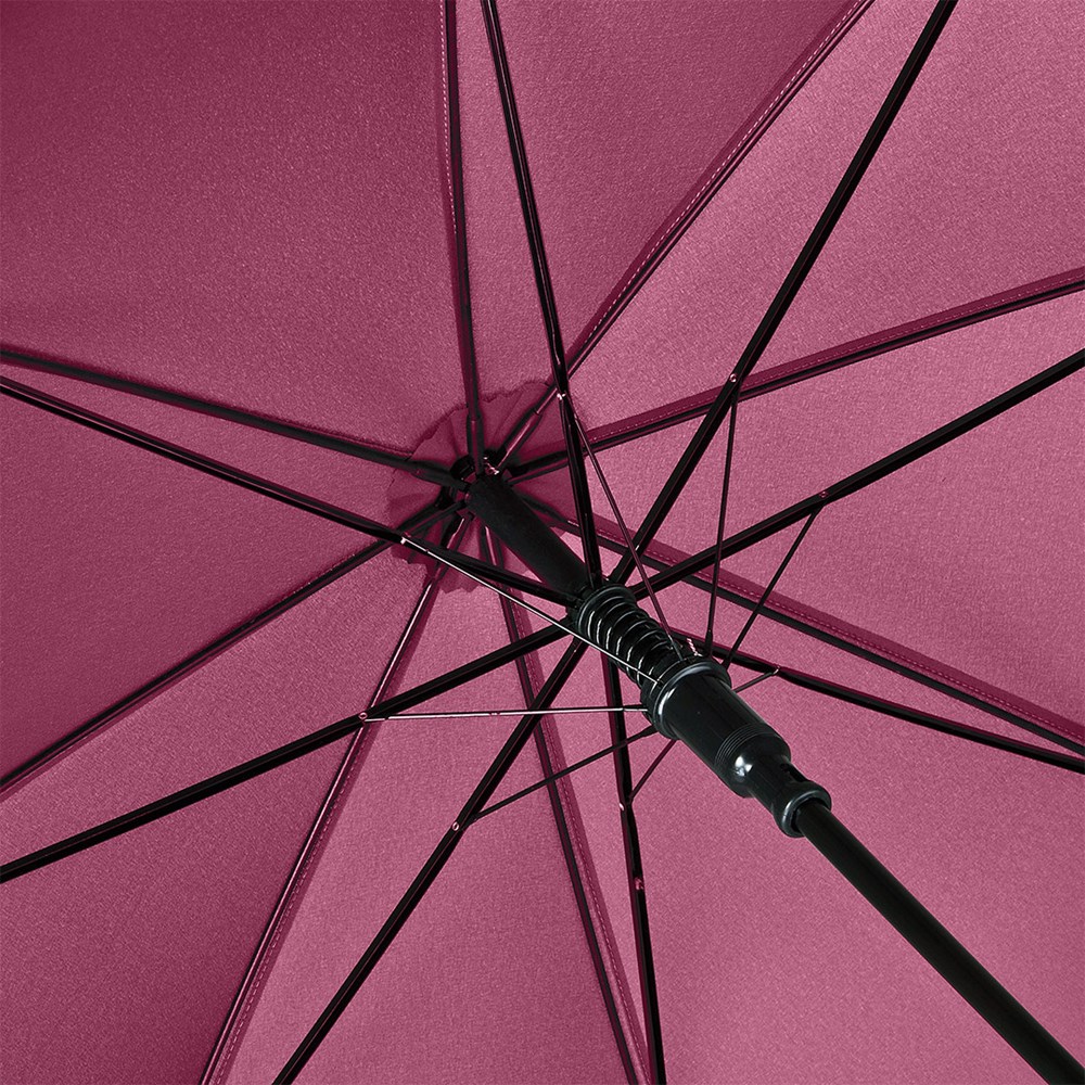 Preislich attraktiver Automatik-Stockschirm mit geflammtem Rundhakengriff aus Echtholz Komfortable Automatik-Funktion zum schnellen Öffnen, Windproof-System für höhere Gestell-Flexibilität und bessere Windsicherheit, flexible Fiberglasschienen, Griff mit laserfähigem Griffring, höherer Korrosionsschutz durch schwarze Galvanisierung des Stahlstocks
