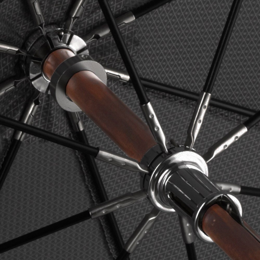 Edler Stockschirm in mittlerer Größe mit vielen Liebhaber-Details der klassischen Schirmmacherkunst Einfache Handhabung durch Öffnungsschieber, hochwertiges Windproof-PLUS-System für eine maximale Gestell-Flexibilität bei stärkeren Windböen, flexible Fiberglasschienen, Echtholzstock in geflammter Optik, glanzverchromte Elemente, klassischer Façonné-Bezug, wasser- und schmutzabweisende Bezugseigenschaften durch original Teflon™ Faserschutz, gerader Griff in geflammtem Ahorn-Echtholz mit verchromten Applikationen und Werbeanbringungsmöglichkeit, Schließband mit verchromtem Druckknopf, hochwertiges Futteral mit Paspelierung und breiter Öffnung